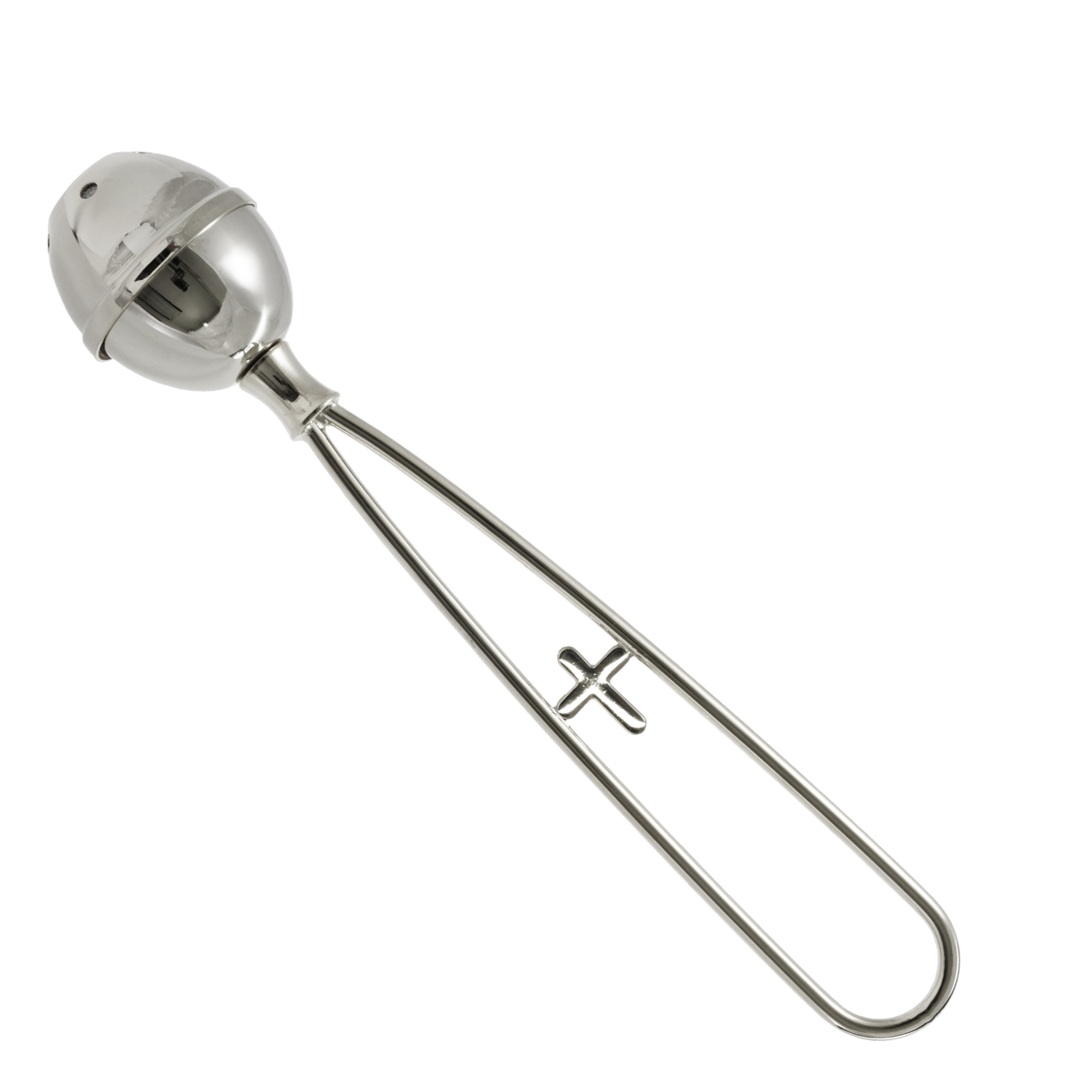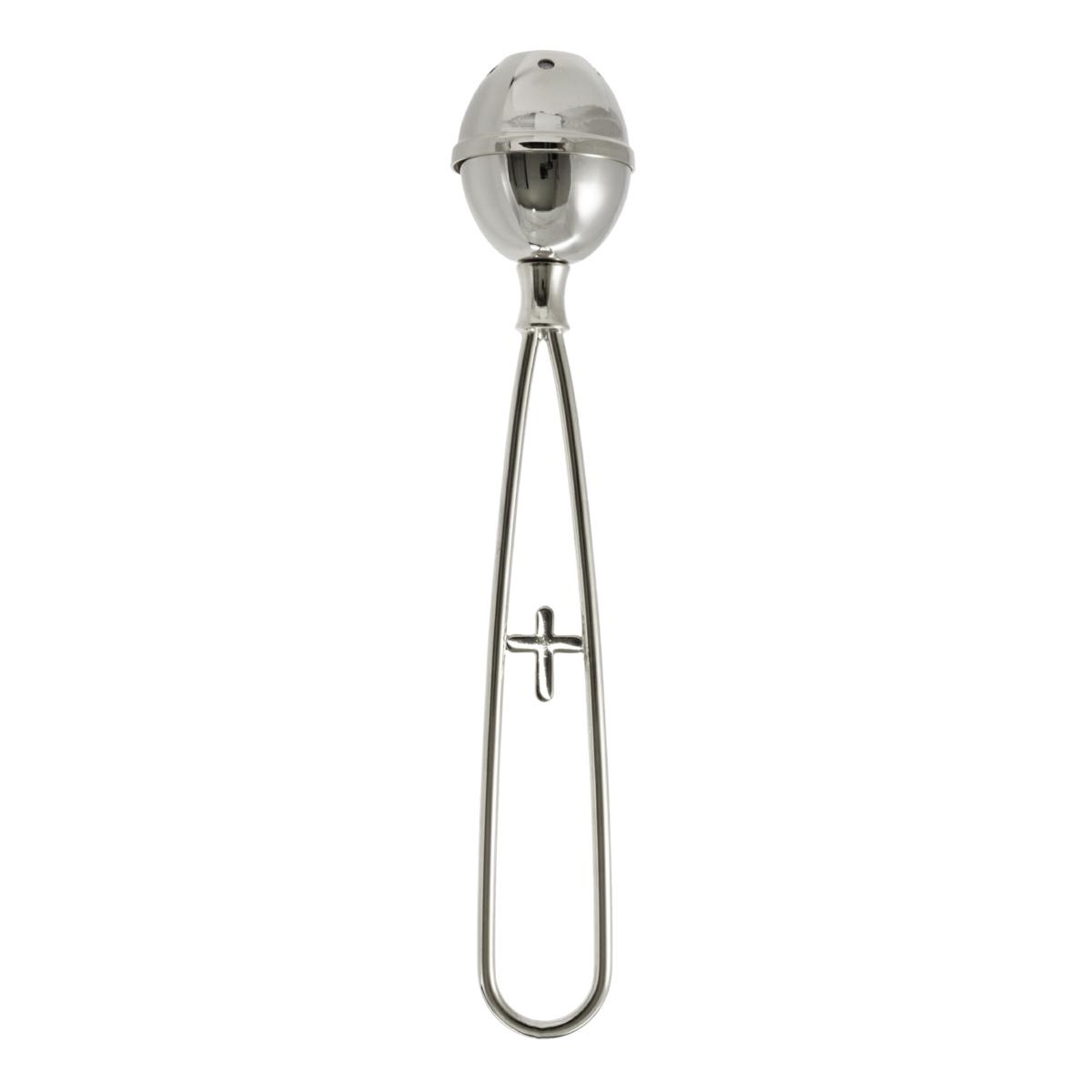 Silver-tone brass blessing sprinkler with cross in the center.