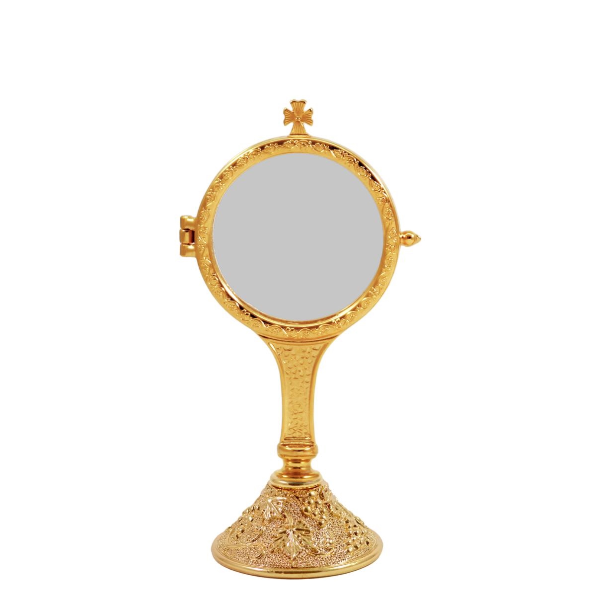 Teca per esposizione dell' Ostia magna in fusione dorata su base uva e foglie di vite. La base è in finitura dorata.