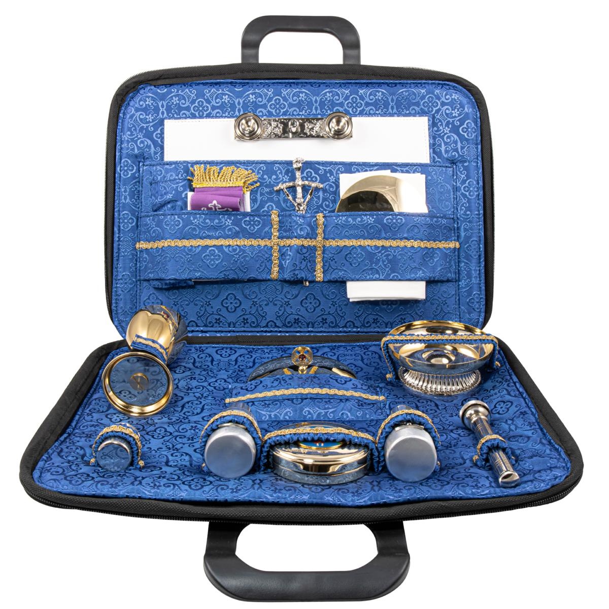 The item is complete with: - Chalice in gold plated brass with hammered base. The chalice is 10.5 cm high with a 6 cm diameter cup and can hold up to 80 ml of wine. - Bowl in gold plated brass with lid. - Asperges in silver-tone brass 11.5 cm with hermetic seal. - Saucer in gold plated brass diameter 10 cm. -Host box in gold plated brass with hand-enamelled decorative plaque. The Pyx has a diameter of 8 cm and holds approximately 40 hosts. - Holy Oils stock in silver-tone brass with cross engraved on the cap. - Cast altar with decoration of grapes and vine leaves in relief and equipped with support for cross and candles. - 30 ml water and wine bottles with distinctive hand-enamelled plaque. - Pastoral cross and wax candles with matching fabric candle holders. - Two-tone purple and white fabric stole, 150 cm. - Set of 5pcs 100% cotton linens with gold-thread embroidered cross.