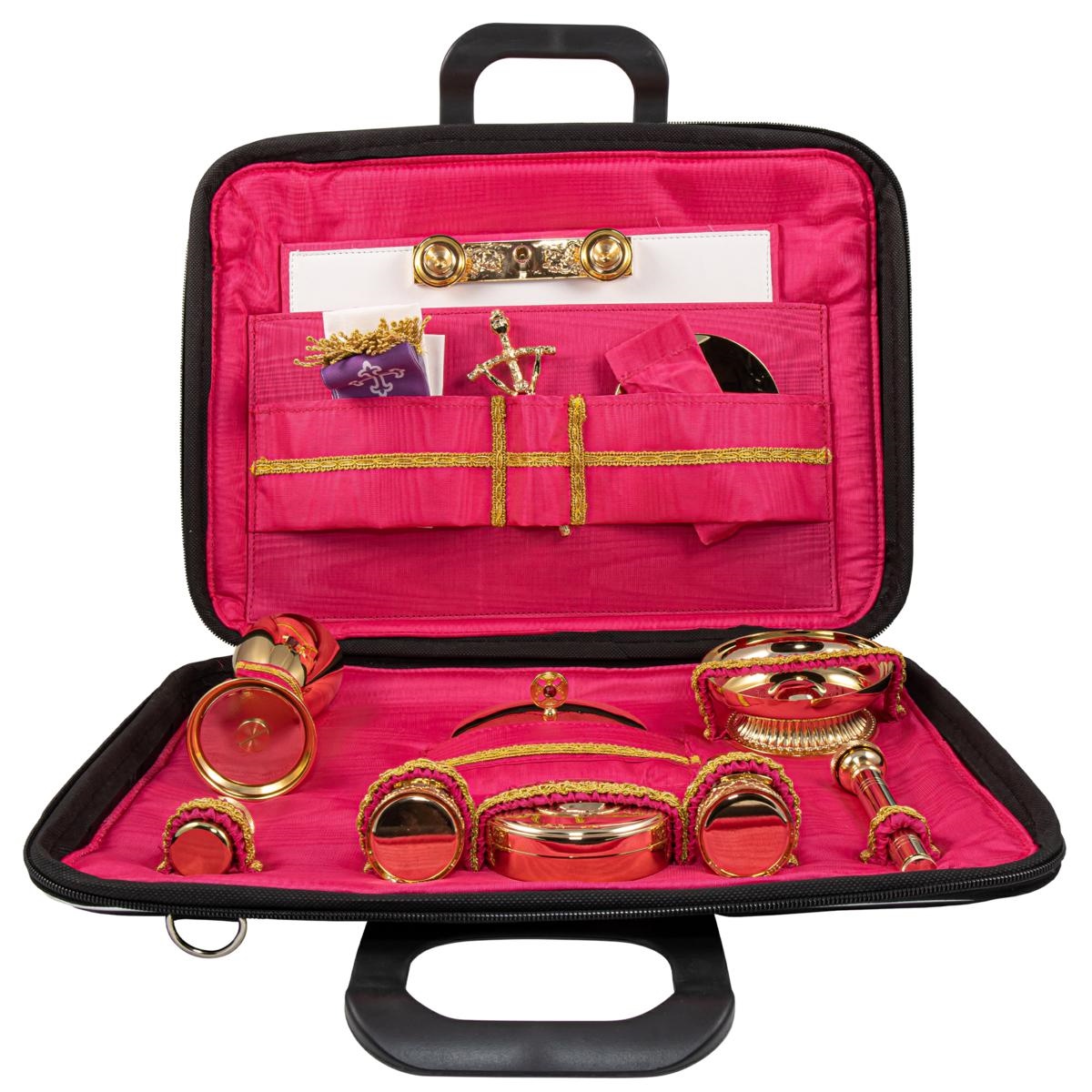 Cartella in Pelle Ecologica con tracolla salvaspalla, internamente foderata in tessuto cremisi e completa di tutto il necessario per la Celebrazione.
