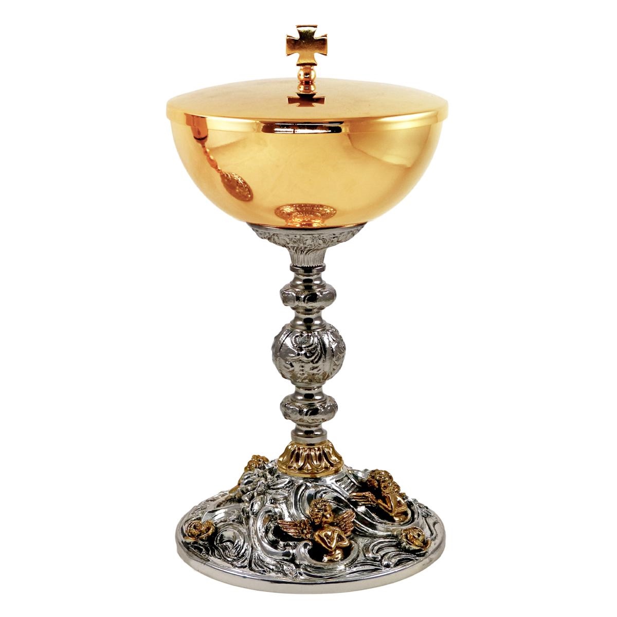 Calice e Pisside in ottone dorato con base barocca in finitura argento antico decorata con Angeli dorati.