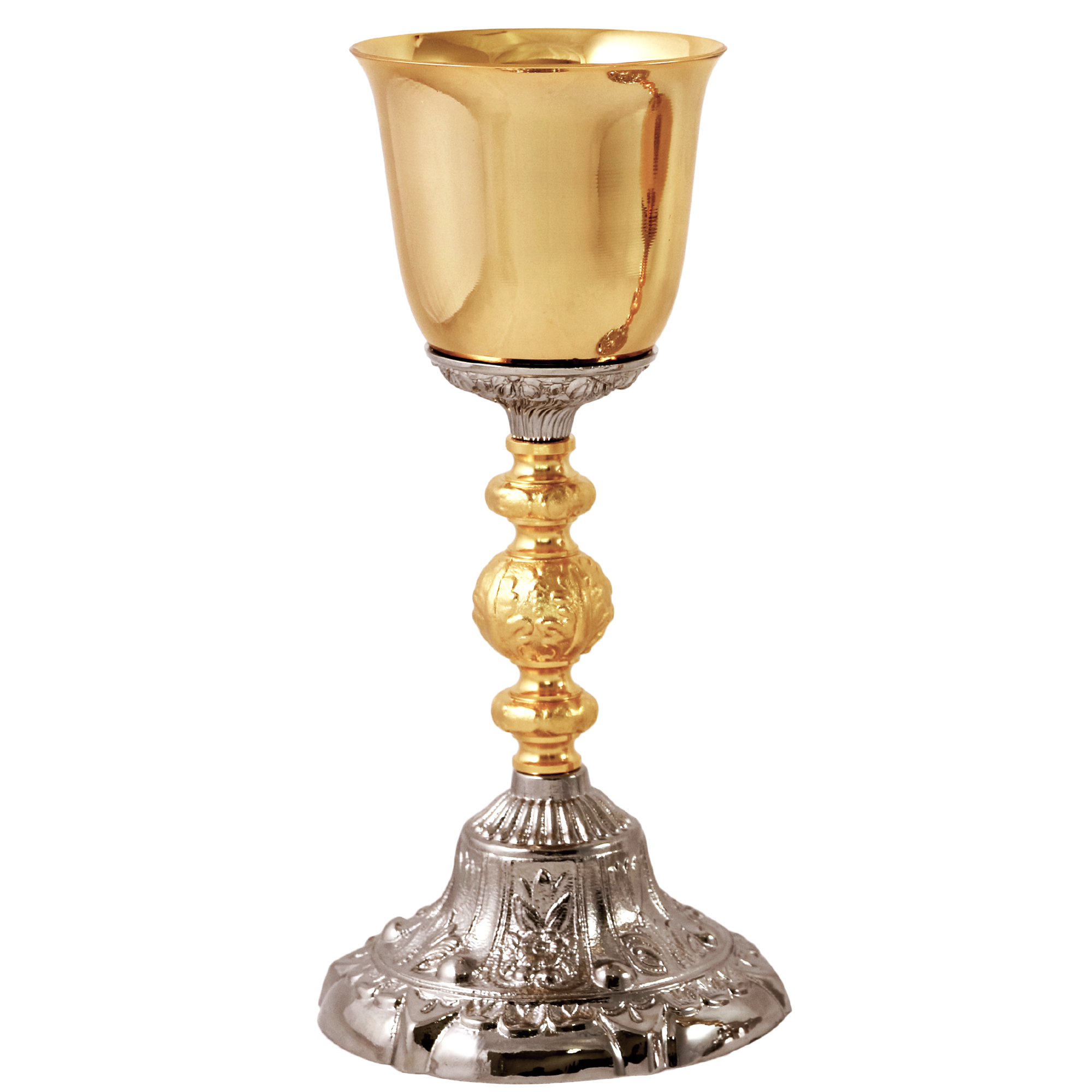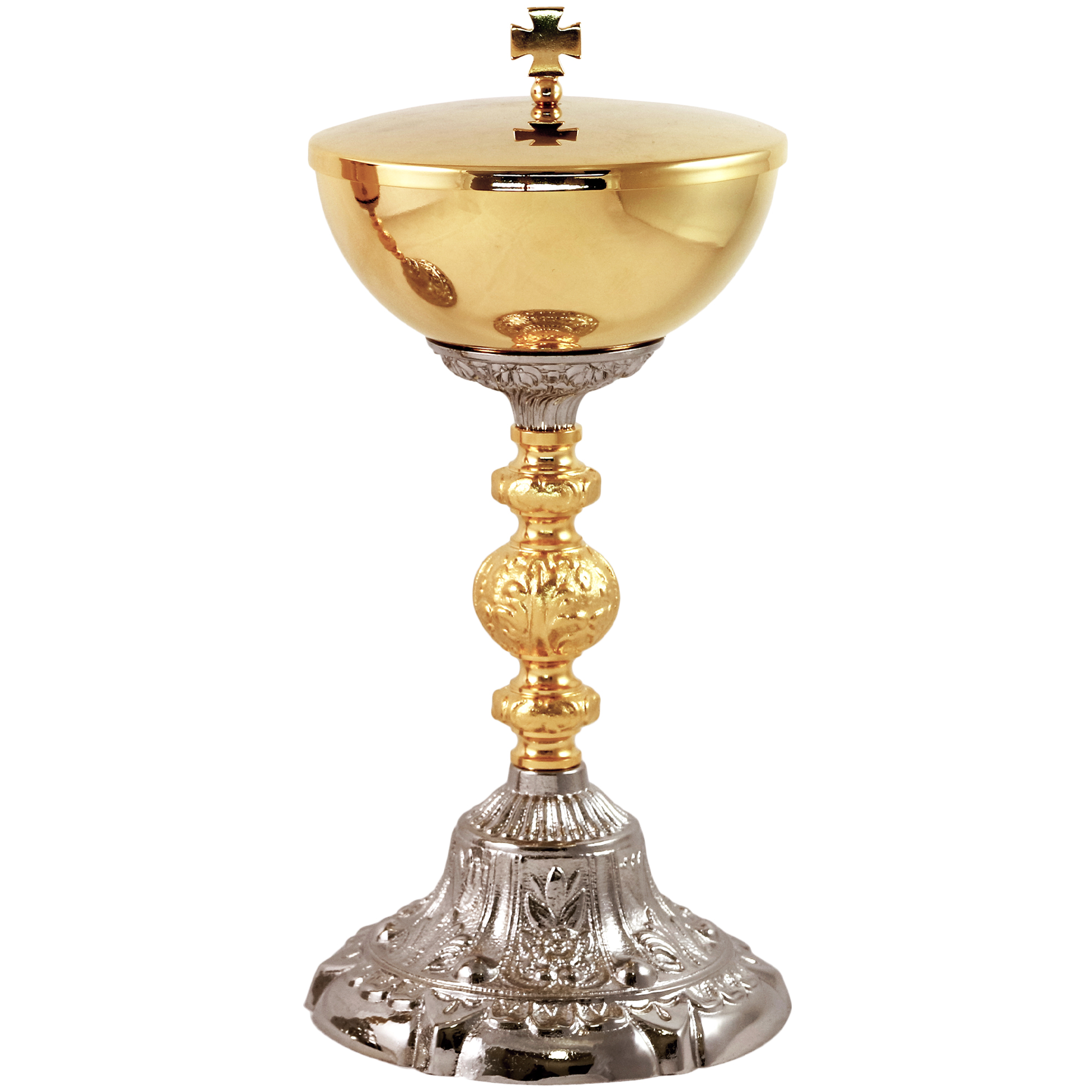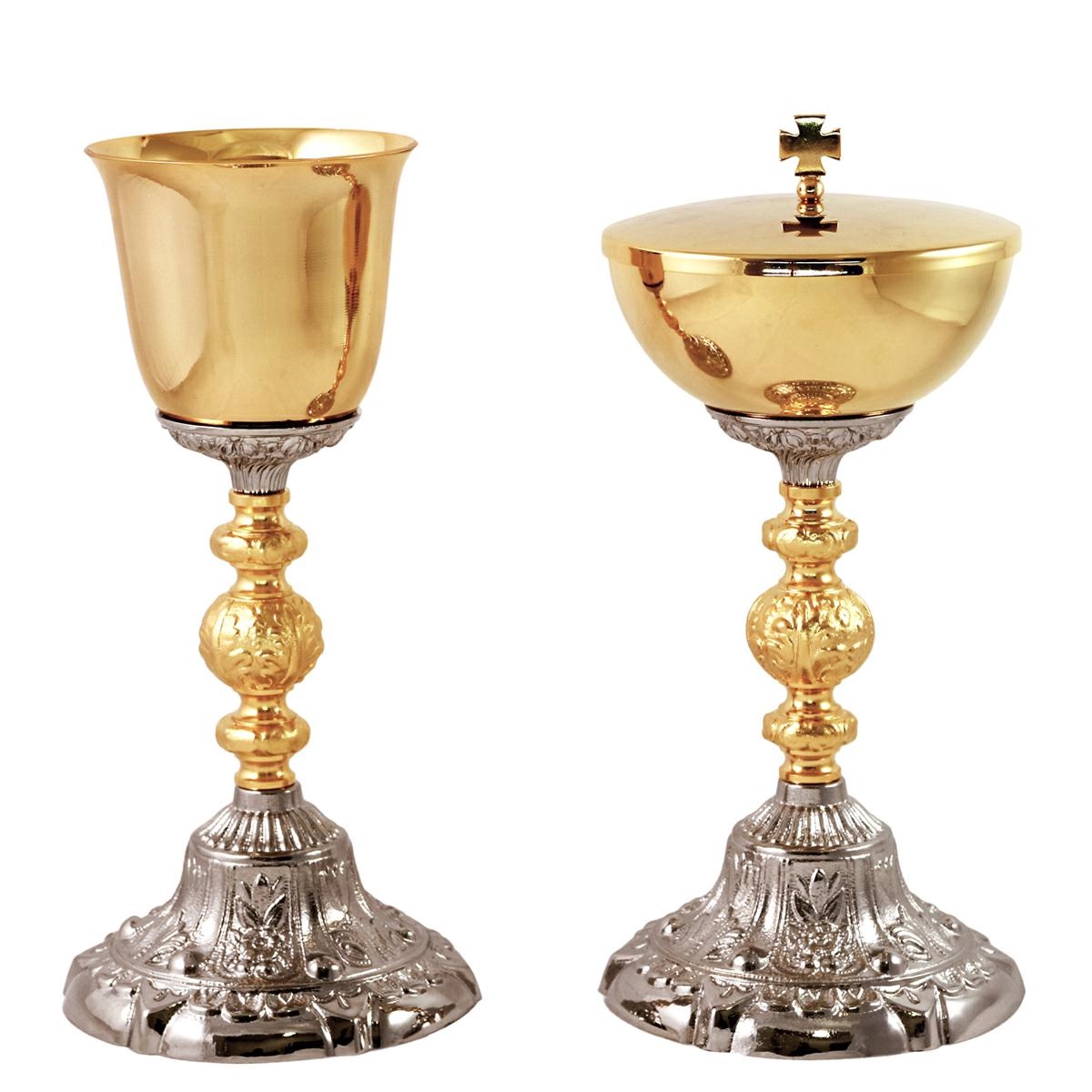 Calice e Pisside in ottone dorato con elegante base e nodo tono argento, decorati in stile barocco.