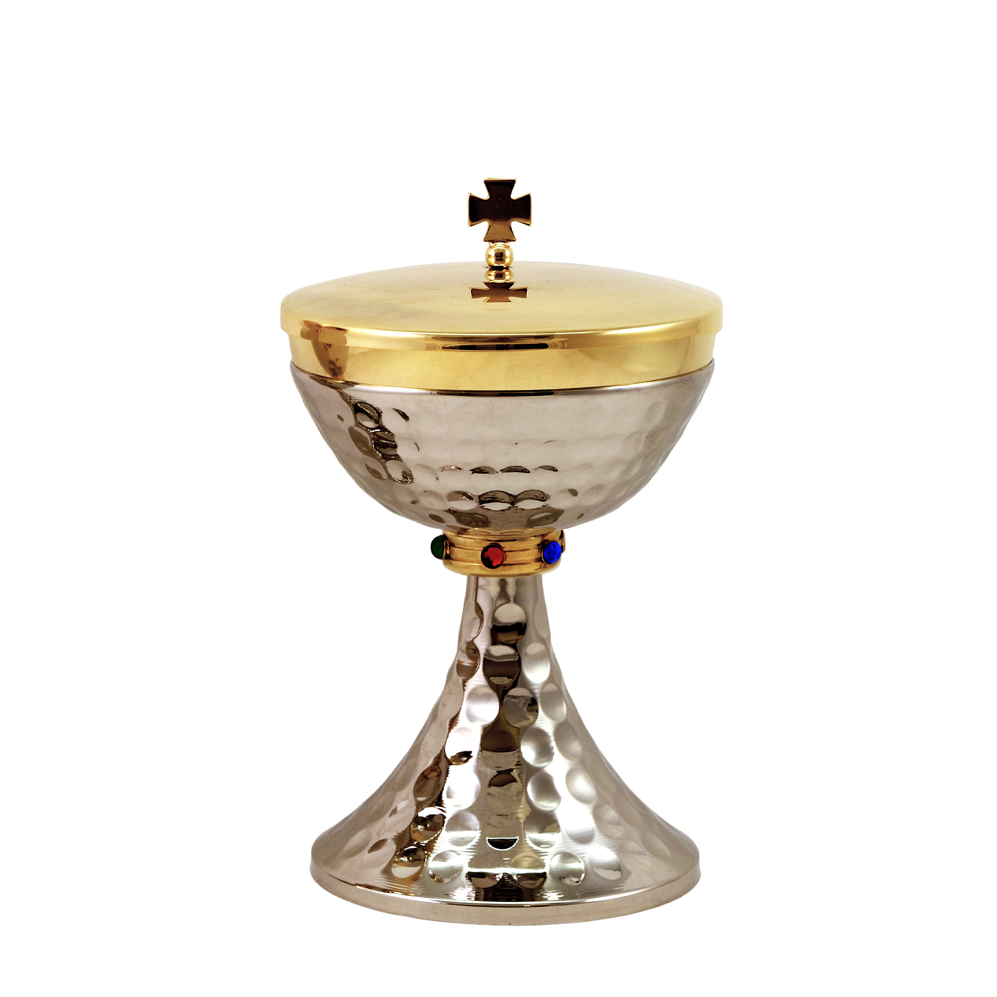 Calice e Pisside in ottone dorato con base e sottocoppa tono argento con martellatura e nodo dorato con pietre colorate.