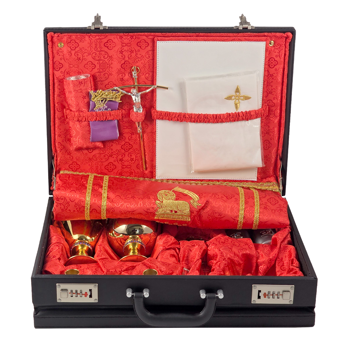 - Pastoral cross, pair of glass flame guards and wax candles with matching fabric candle holders.