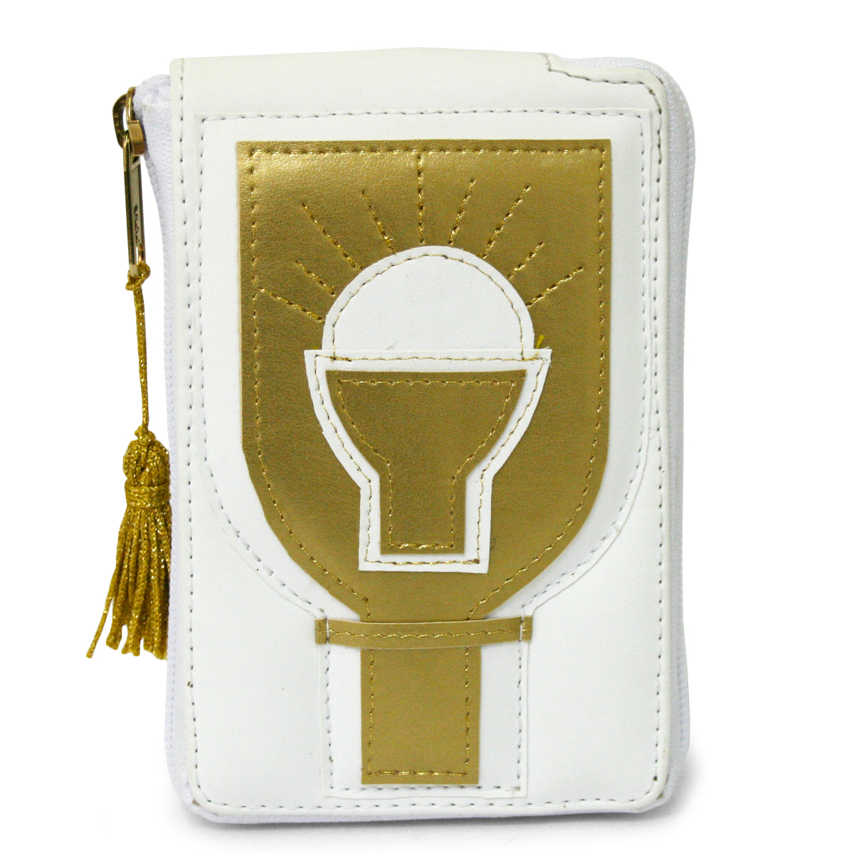 Pocket viaticum case in white eco-leather, internally lined in damask satin. On the front there are golden eco-leather inserts depicting a chalice. Complete with: - Eucharistic chest in gold plated brass with engraved decorative hand-enamelled plaque. The chest has a diameter of 3 cm and contains approximately 6 hosts. - Asperges in gold plated brass 8.5 cm with hermetic seal. - Holy Oil stock in gold plated brass with ring. - Cast golden cross. - Two-tone purple and white stole 150 cm. - 100% cotton linen 10x10 cm.with cross embroidered in gold thread.