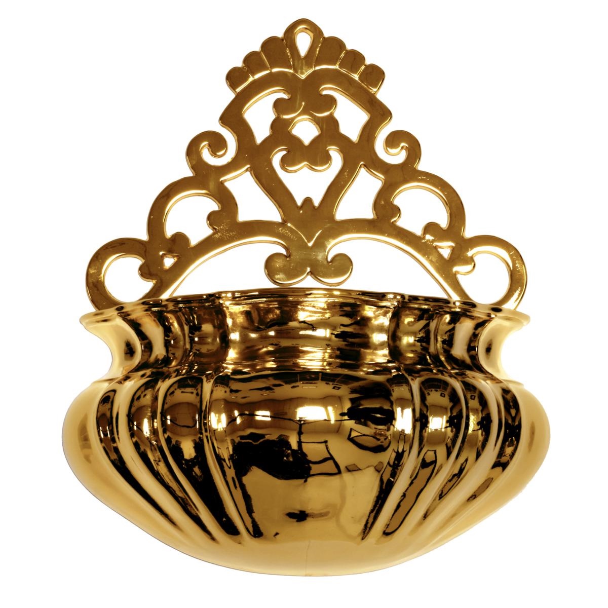 Acquasantiera in ottone con finitura dorata di altezza 32 cm e diametro della vasca di 28x11 cm.