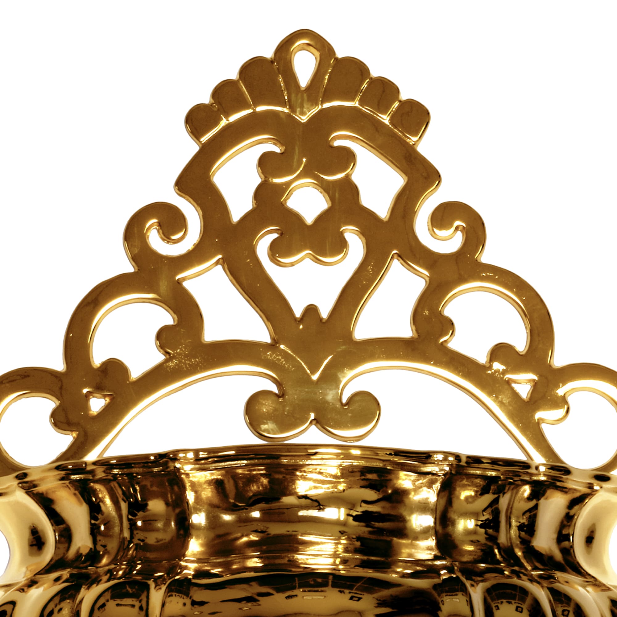 Questa acquasantiera è caratterizzata da un decoro raffigurante una conchiglia. Grazie al forellino nella parte superiore, è possibile appenderla al muro.