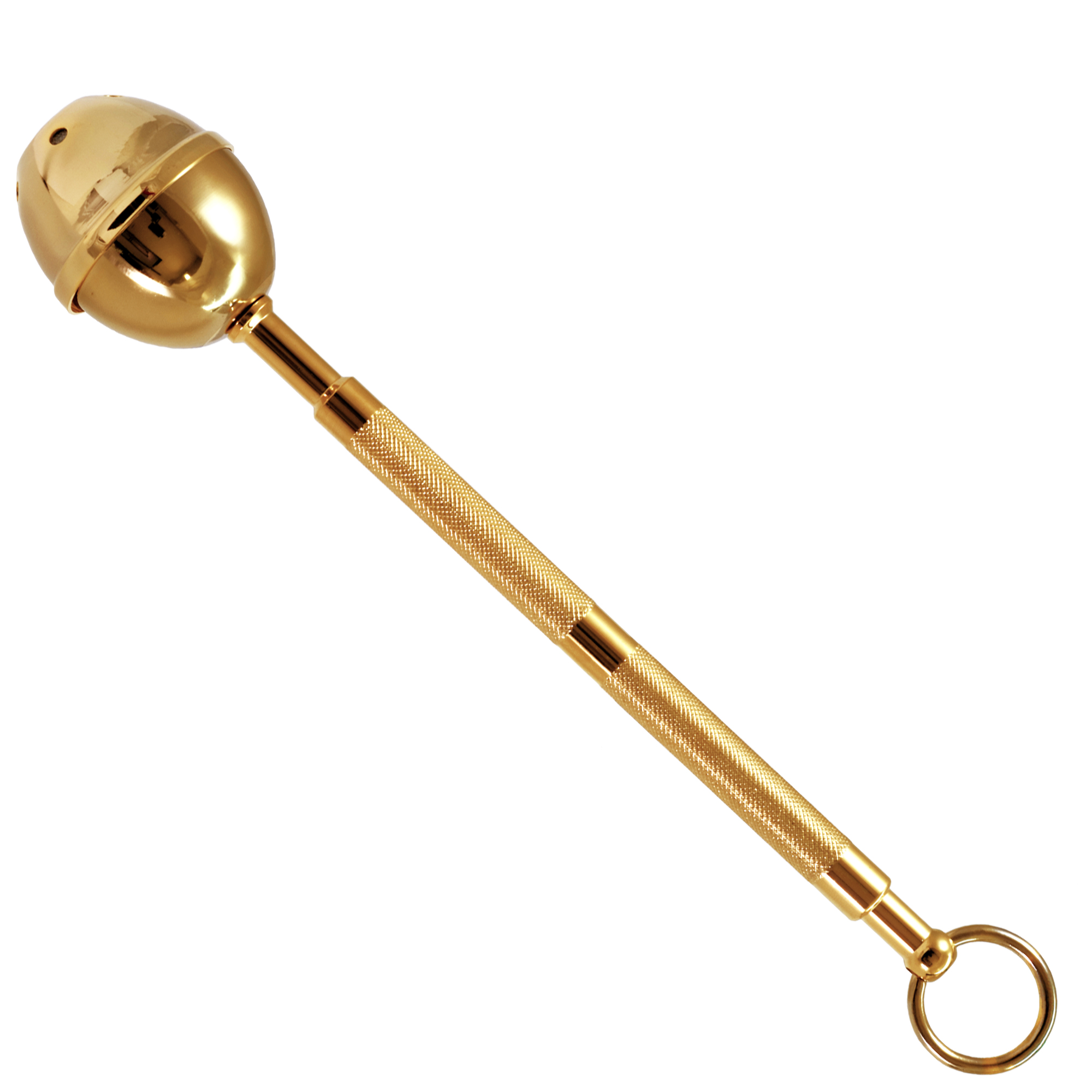 Blessing sprinkler in gold-plated brass with a knurled handle. Thanks to its practical ring on the handle, it can be hung on a thurible case