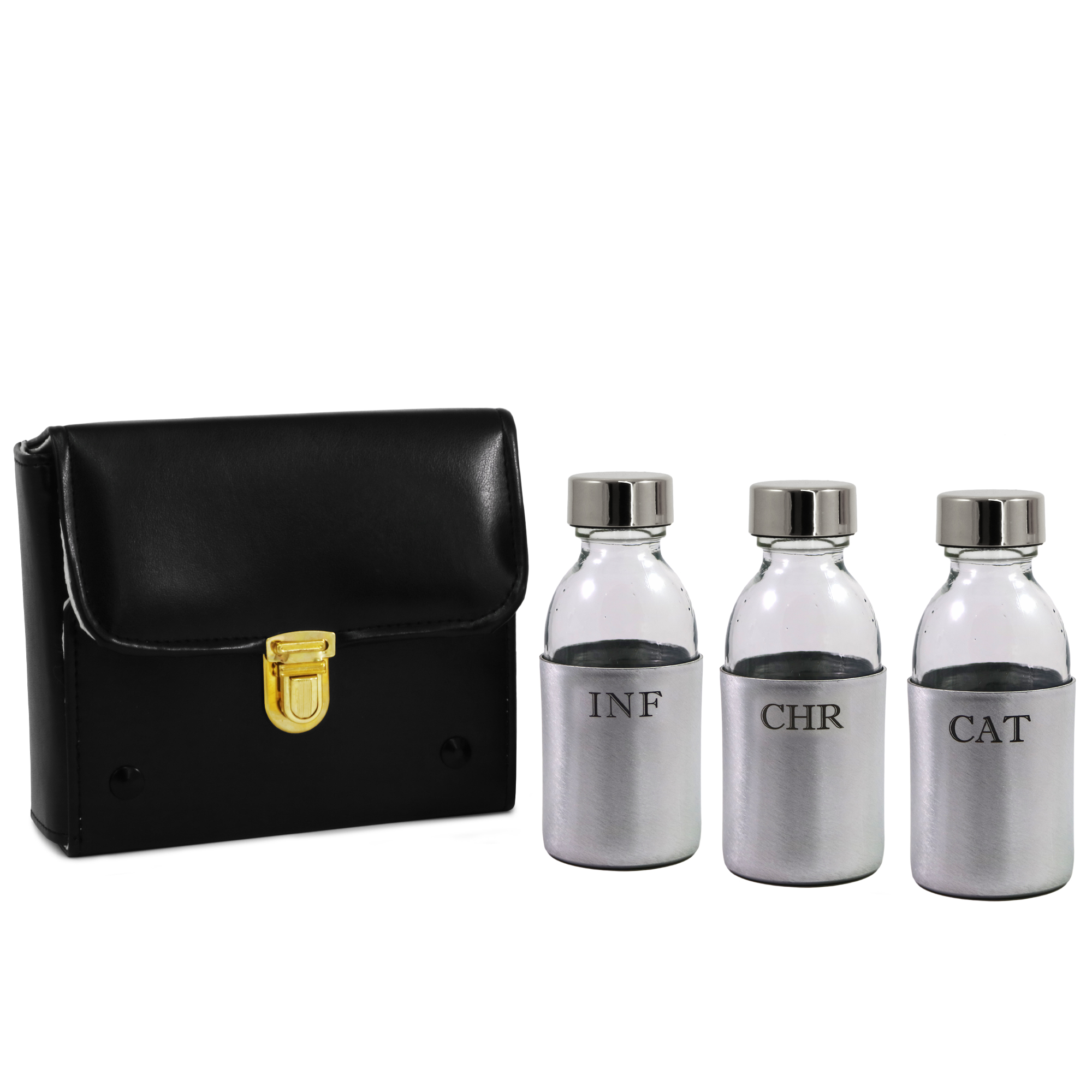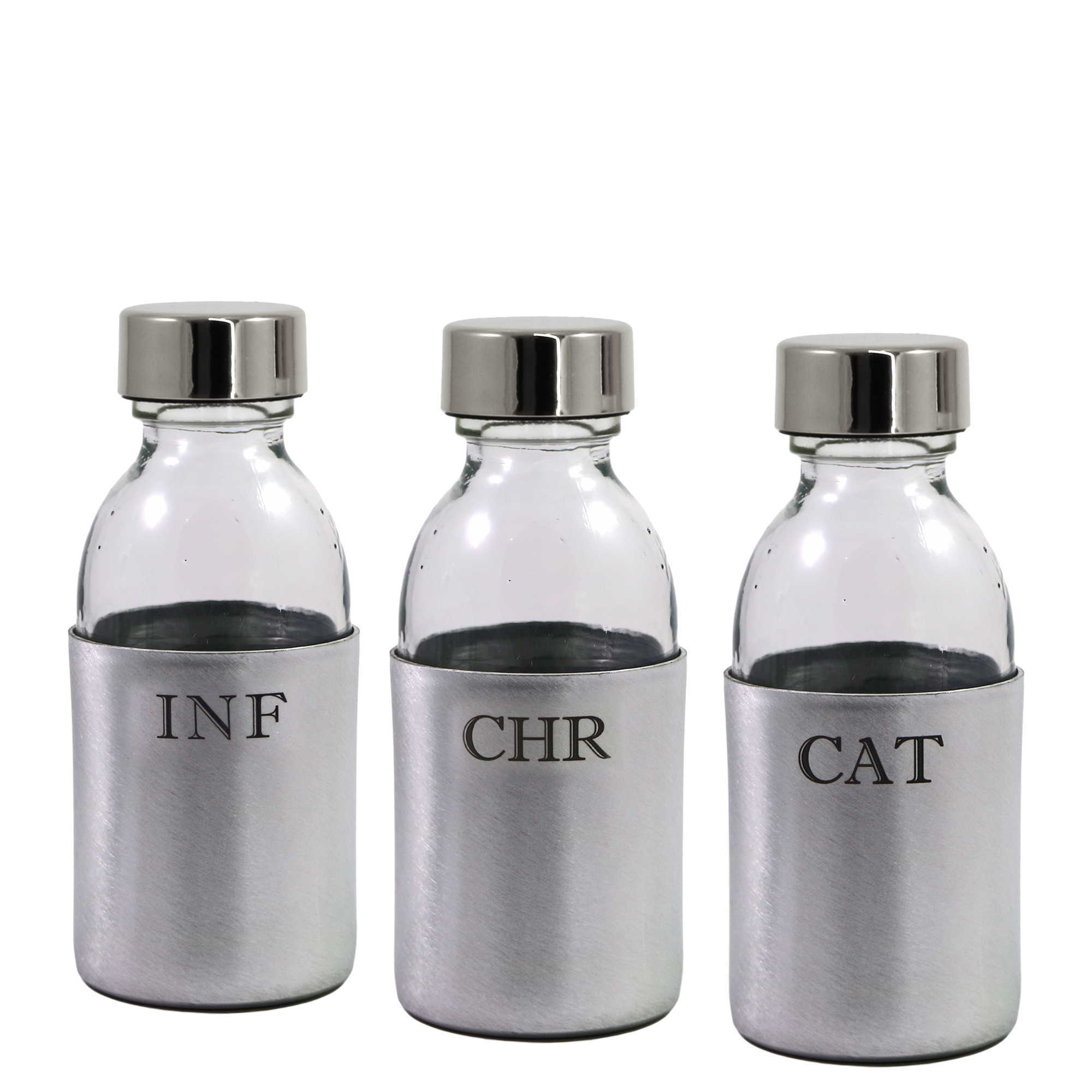 Le bottiglie sono dotate di corazza protettiva in alluminio e sono incise INF-CHR-CAT.