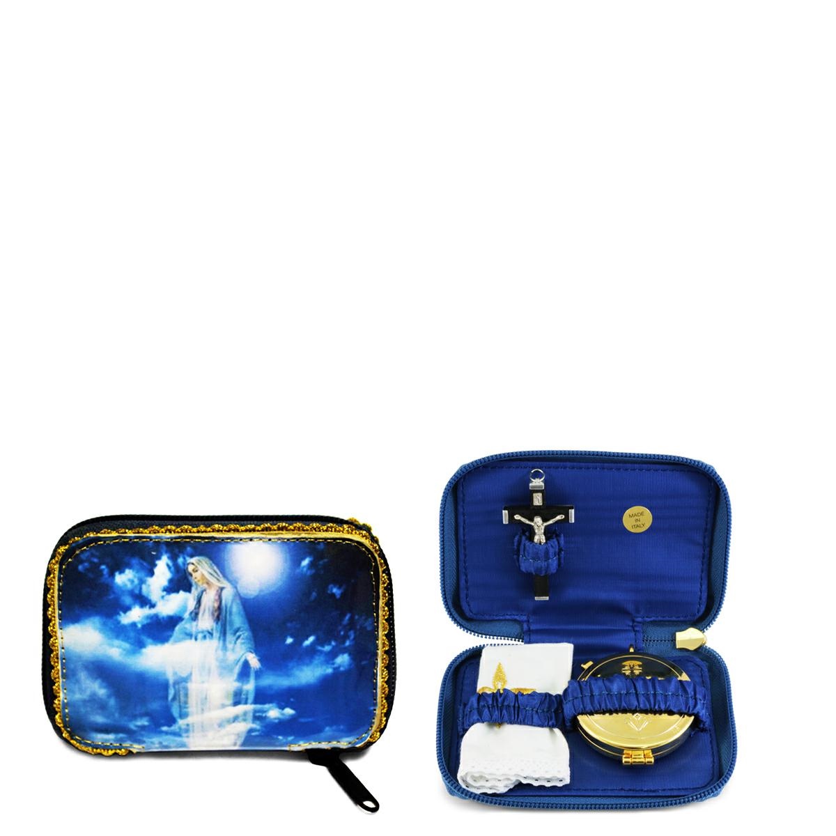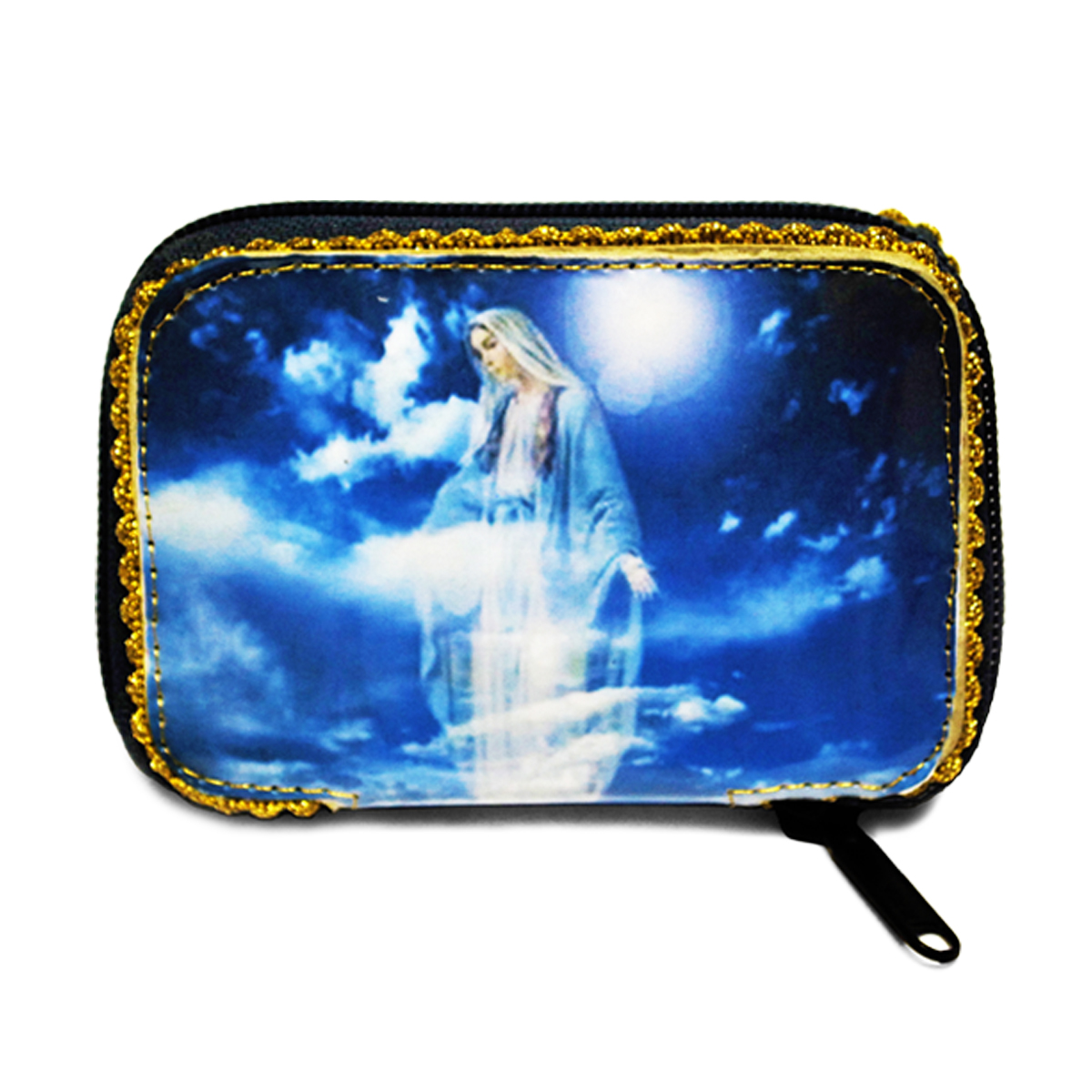 Astuccio portaviatico tascabile con immagine della Beata Vergine e internamente foderato in raso blu.