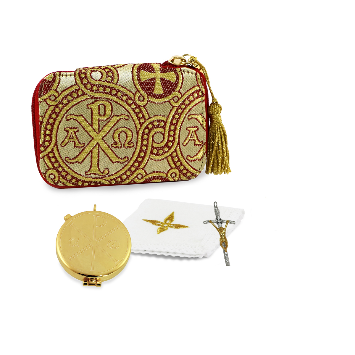 -Teca Eucaristica in ottone dorato con incisione Alfa e Omega. La teca ha un diametro di 5,3 cm. e contiene circa 12 particole.