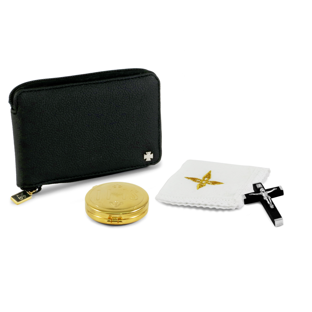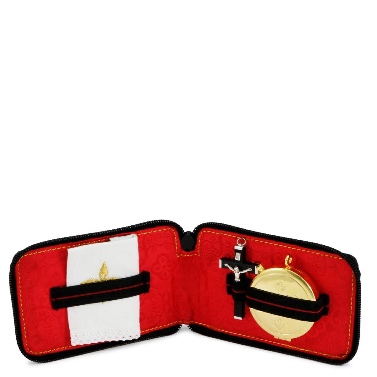 Pocket viaticum pouch in genuine black leather, internally lined in red satin. On the front there is a silver cross. Complete with: - Eucharistic pyx in gold-plated brass with IHS engraving. The pyx has a diameter of 5.3 cm and contains approximately 12 hosts. - Wooden cross. - 100% cotton linen 10x10 cm. with cross embroidered with gold thread.