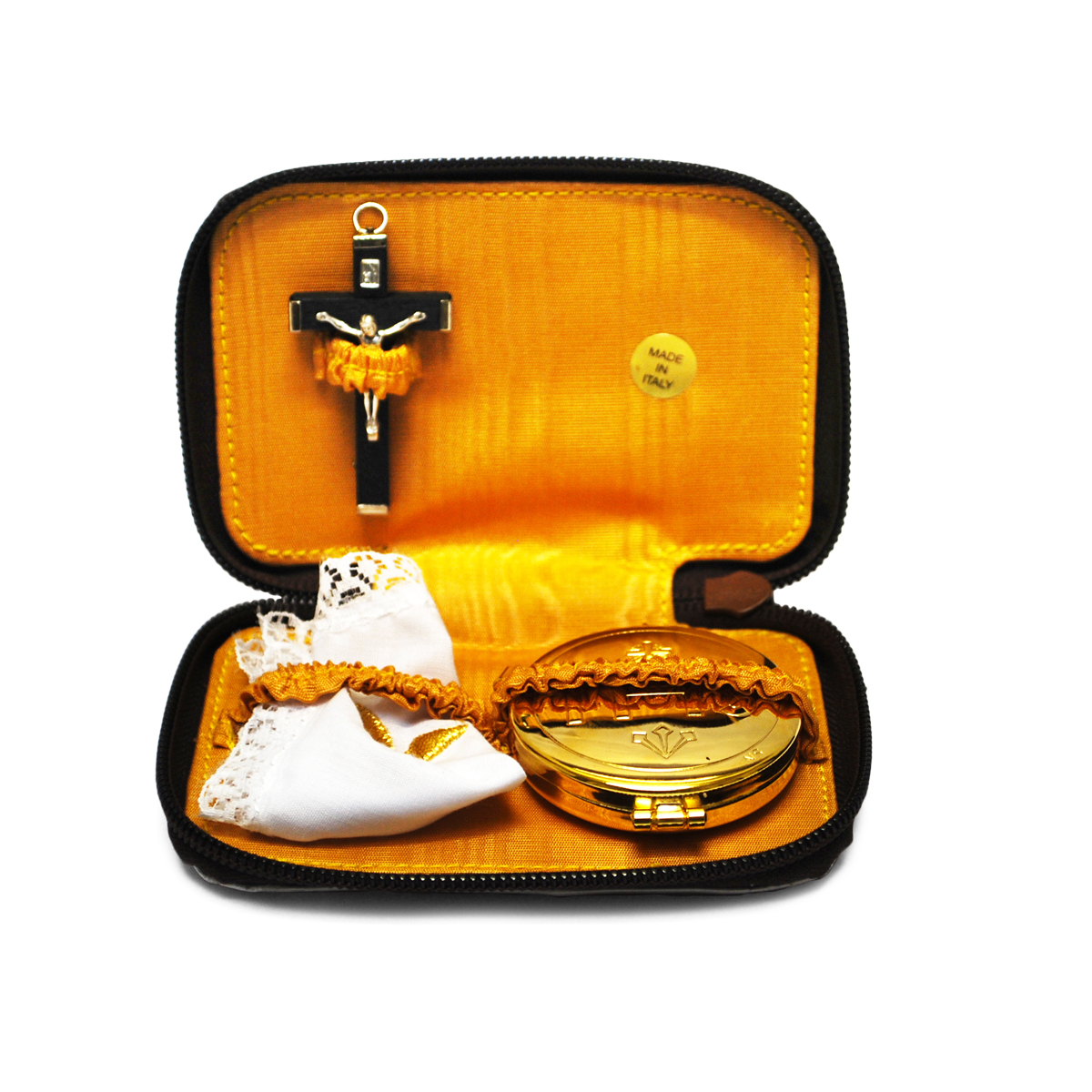 -Teca in ottone dorato con incisione IHS. La teca ha un diametro di 5,3 cm. e contiene circa 12 particole.