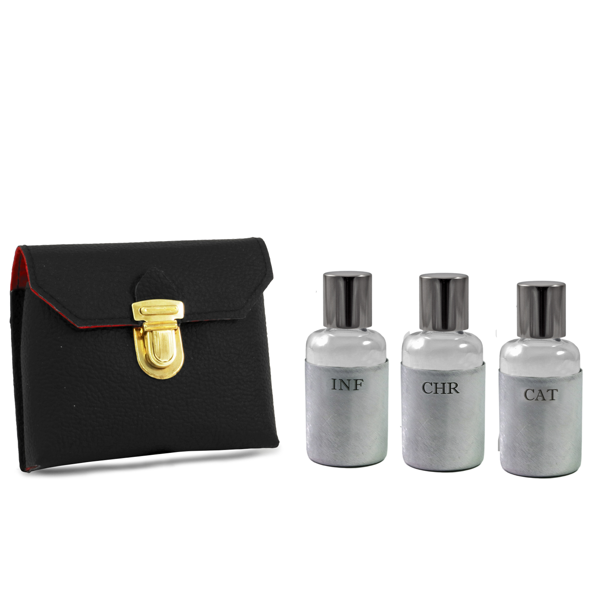 Astuccio in Vera Pelle nera, internamente foderato in raso rosso e completo di tre bottiglie in vetro per oli Santi.