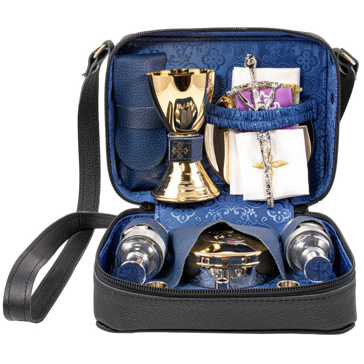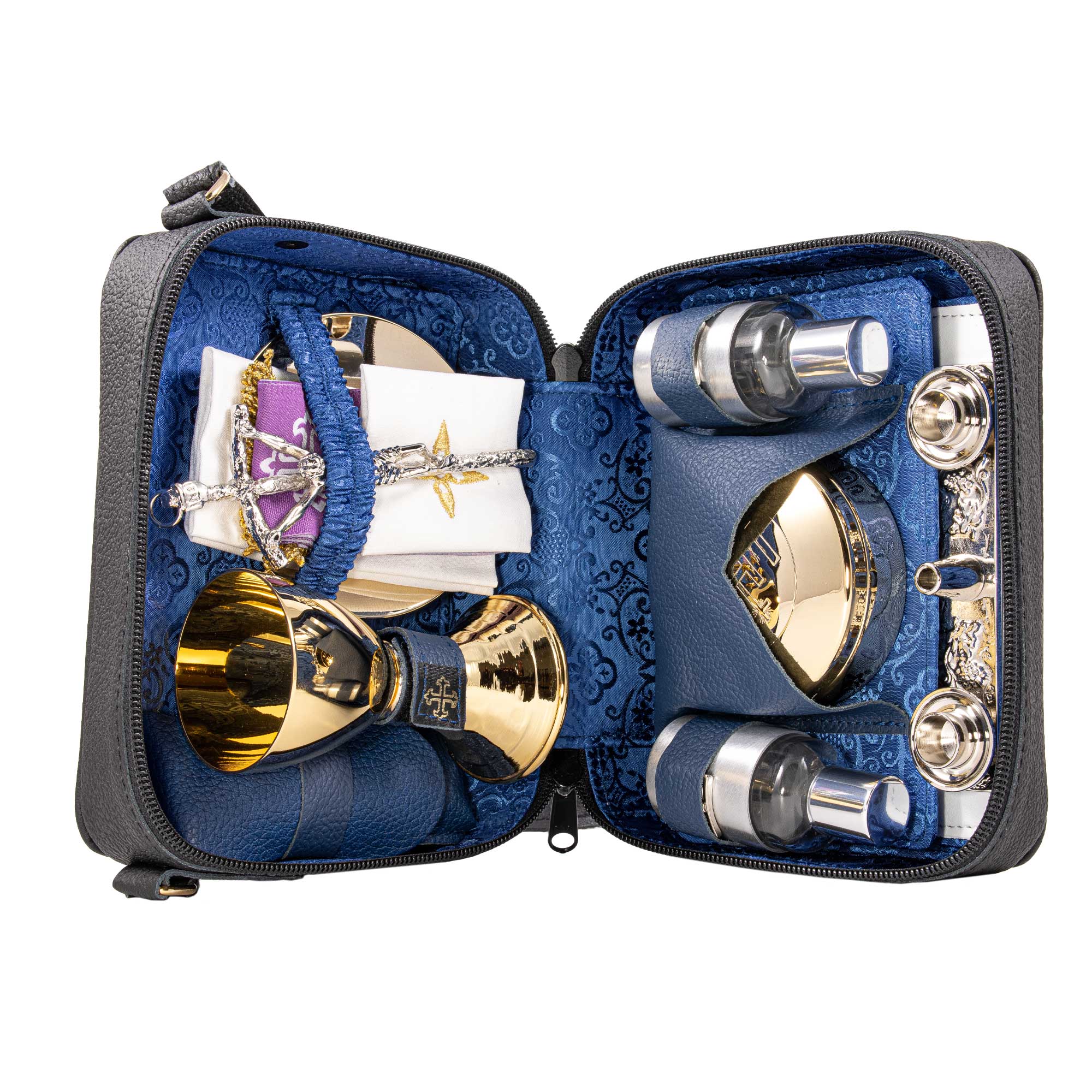 Borsello in Vera Pelle con tracolla, internamente foderato in Raso blu e completo di tutto il necessario per la celebrazione all' aperto.