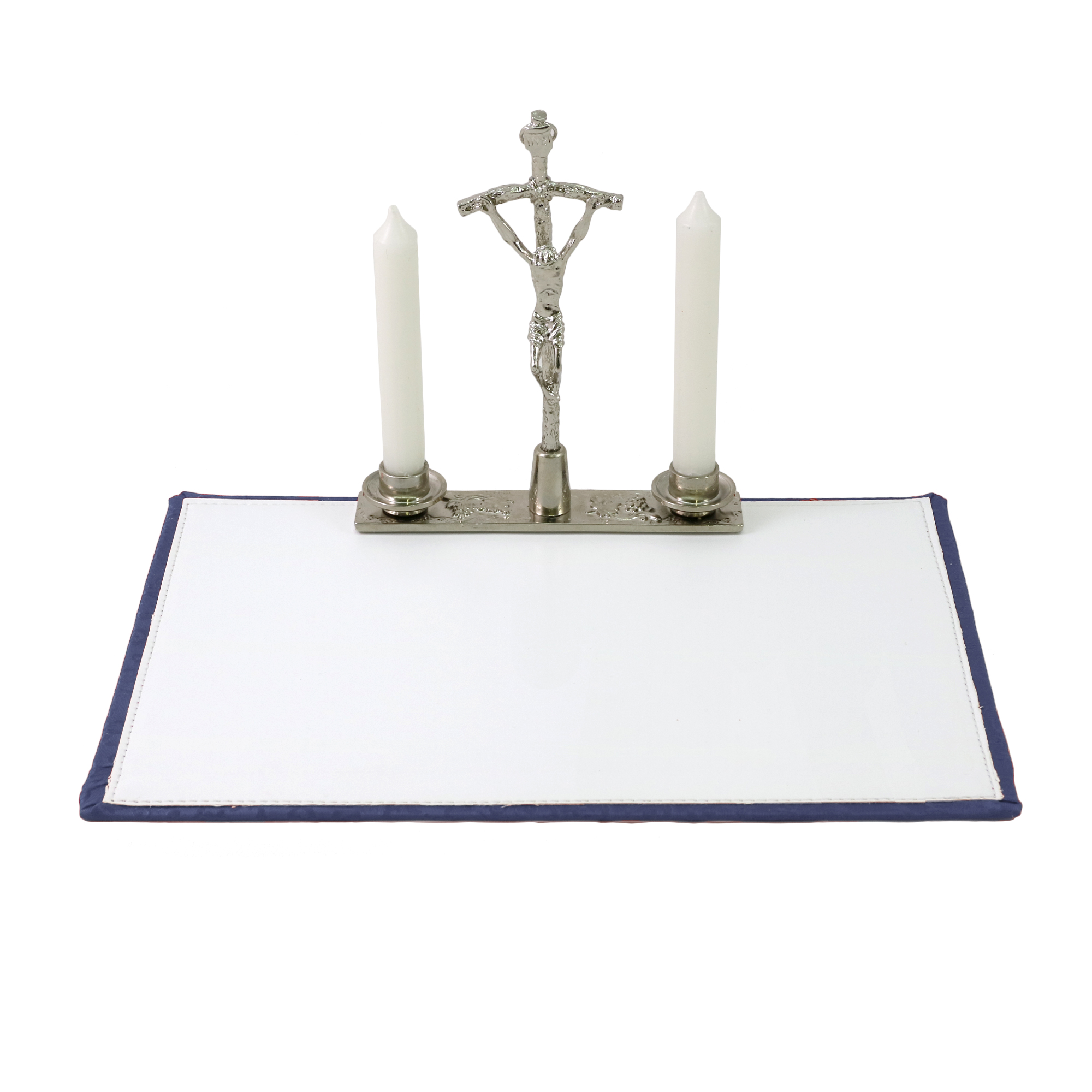 -Croce Pastorale e Candele in cera con portacandele in tessuto coordinato.