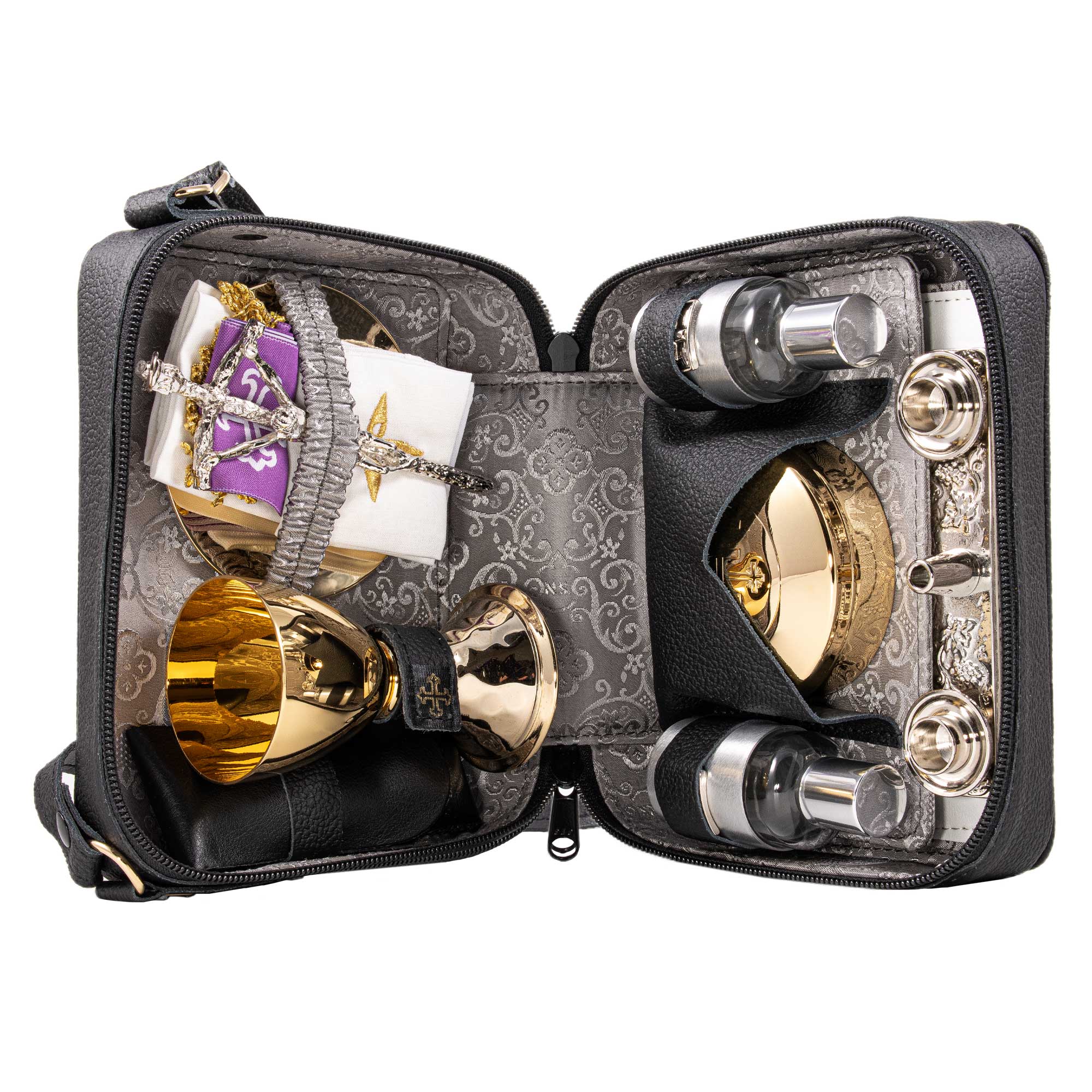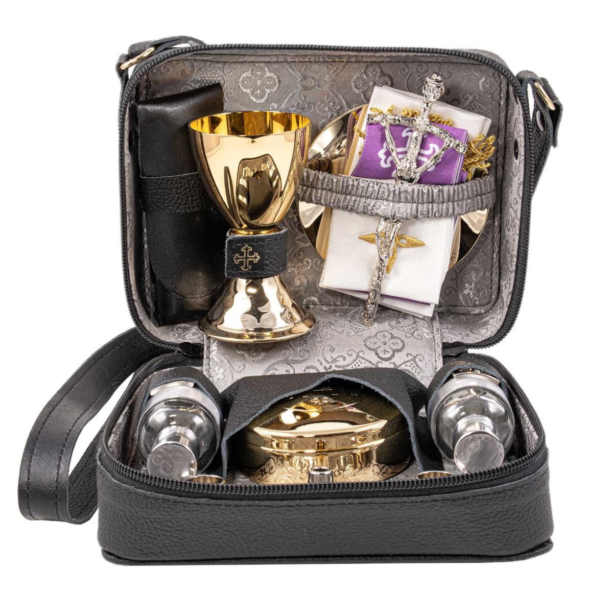 Borsello in Vera Pelle con tracolla, internamente foderato in Raso grigio e completo di tutto il necessario per la celebrazione all' aperto.