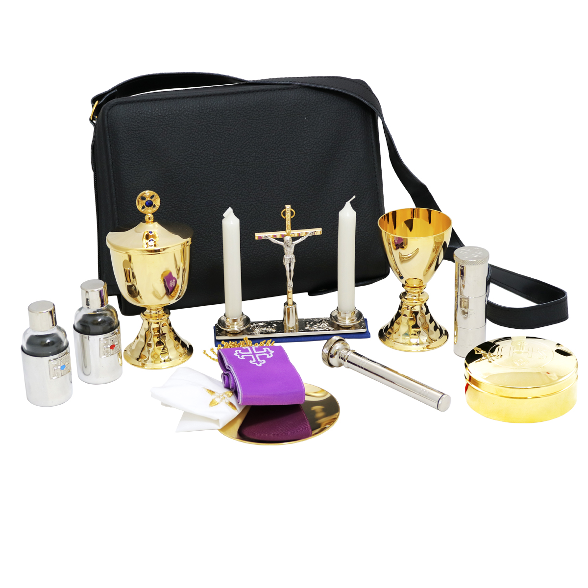The item is complete with: - Chalice and ciborium in gold plated brass with simple base. The chalice is 12.5 cm high with a cup with a diameter of 8 cm and can hold up to 120 ml of wine. The ciborium is 12.5 cm high with a cup with a diameter of 8 cm and contains approximately 60 hosts. - Saucer in gold plated brass with a diameter of 10 cm. - Asperges in silver-tone brass 11.5 cm with hermetic seal. - Triple Holy Oils stock in silver-tone brass, with screw-on shelves divided by INF CHRIS CAT and cross engraved on the lid. - Cast altar with decoration of grapes and vine leaves in relief and equipped with a support for a cross and candles. - 30 ml water and wine bottles with protective armor and distinctive hand-enamelled plates. - Pastoral cross and wax candles with matching fabric candle holders. - Two-tone stole in purple and white fabric, 150 cm. - Set of 5pcs 100% cotton linens with gold-thread embroidered cross.