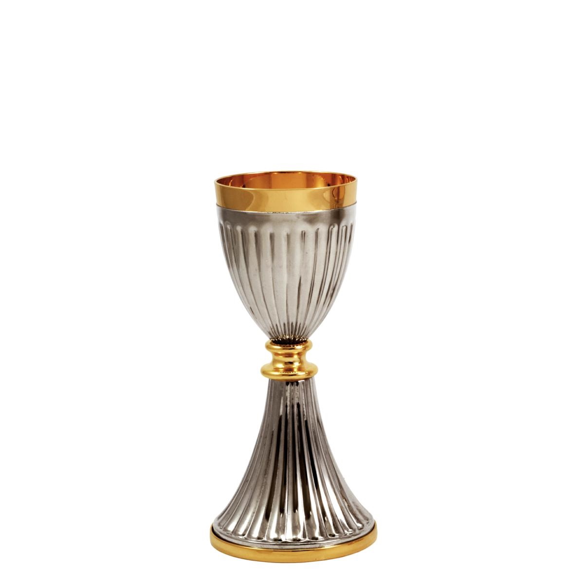 Calice e Pisside in ottone dorato con base e sottocoppa in finitura tono argento con particolare rigatura.