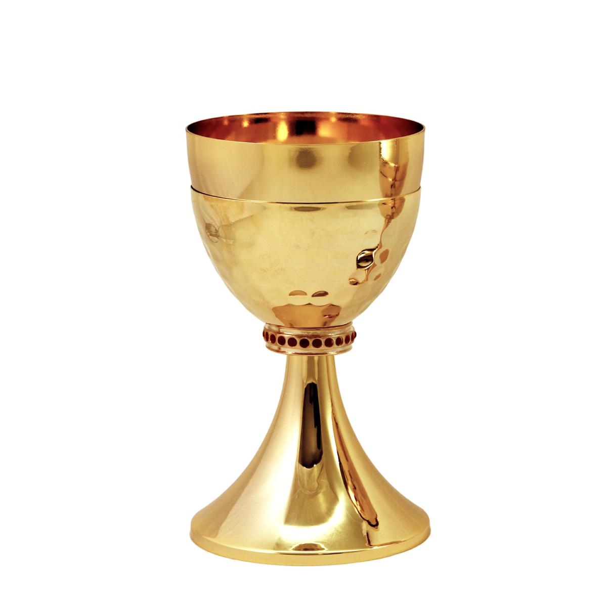 Chalice and Ciborium in gold plated brass with a hammered gold saucer and a knot decorated with red stones.