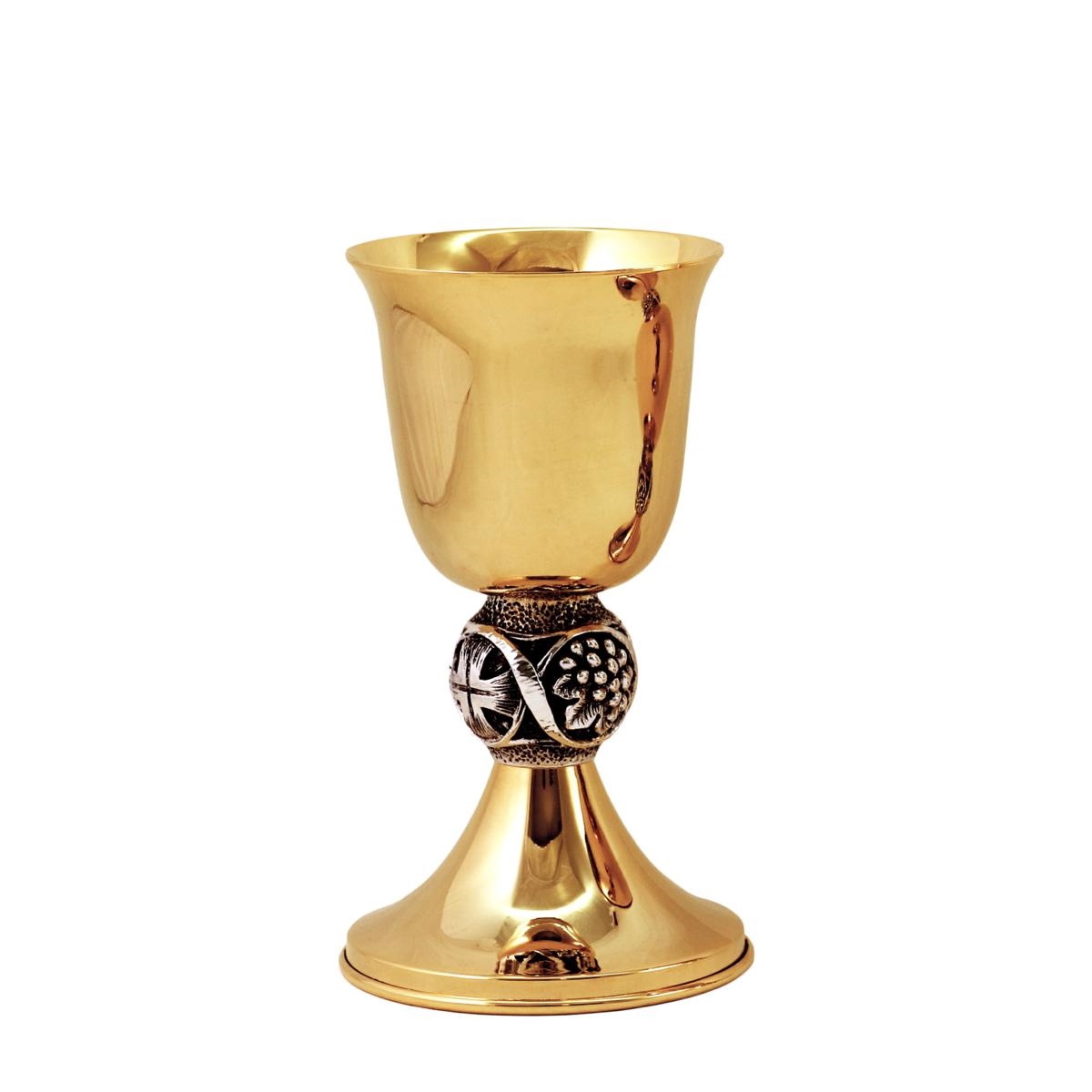 Calice e Pisside in ottone dorato con elegante nodo con motivo "Croce e Uva" in finitura argento antico.