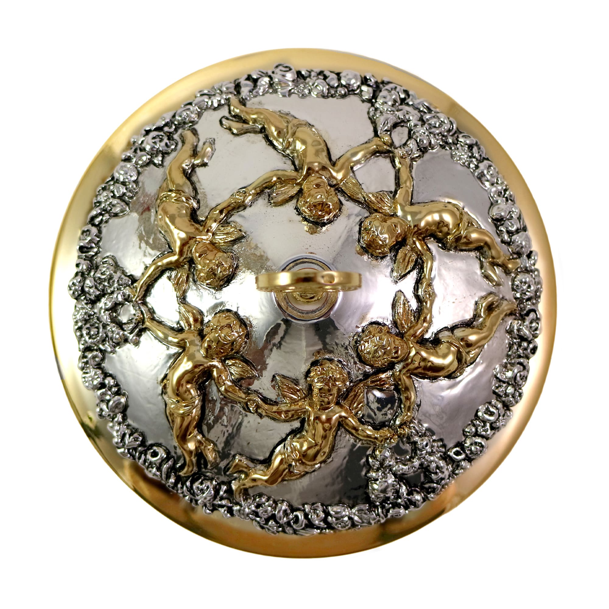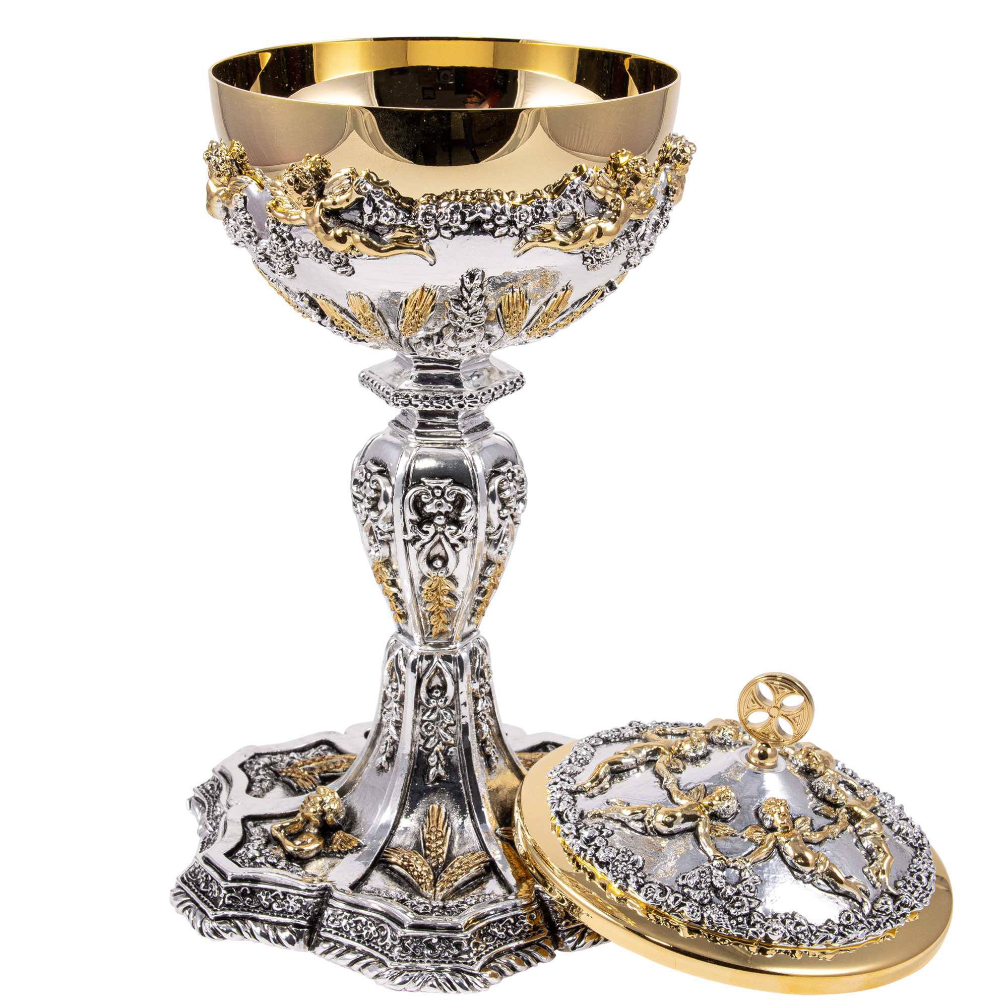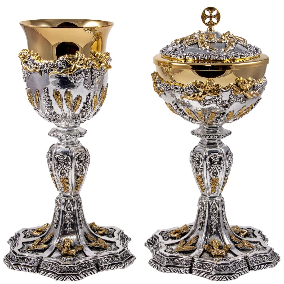 BAROQUE CHALICE AND CIBORIUM WITH GOLD PLATED ANGELS