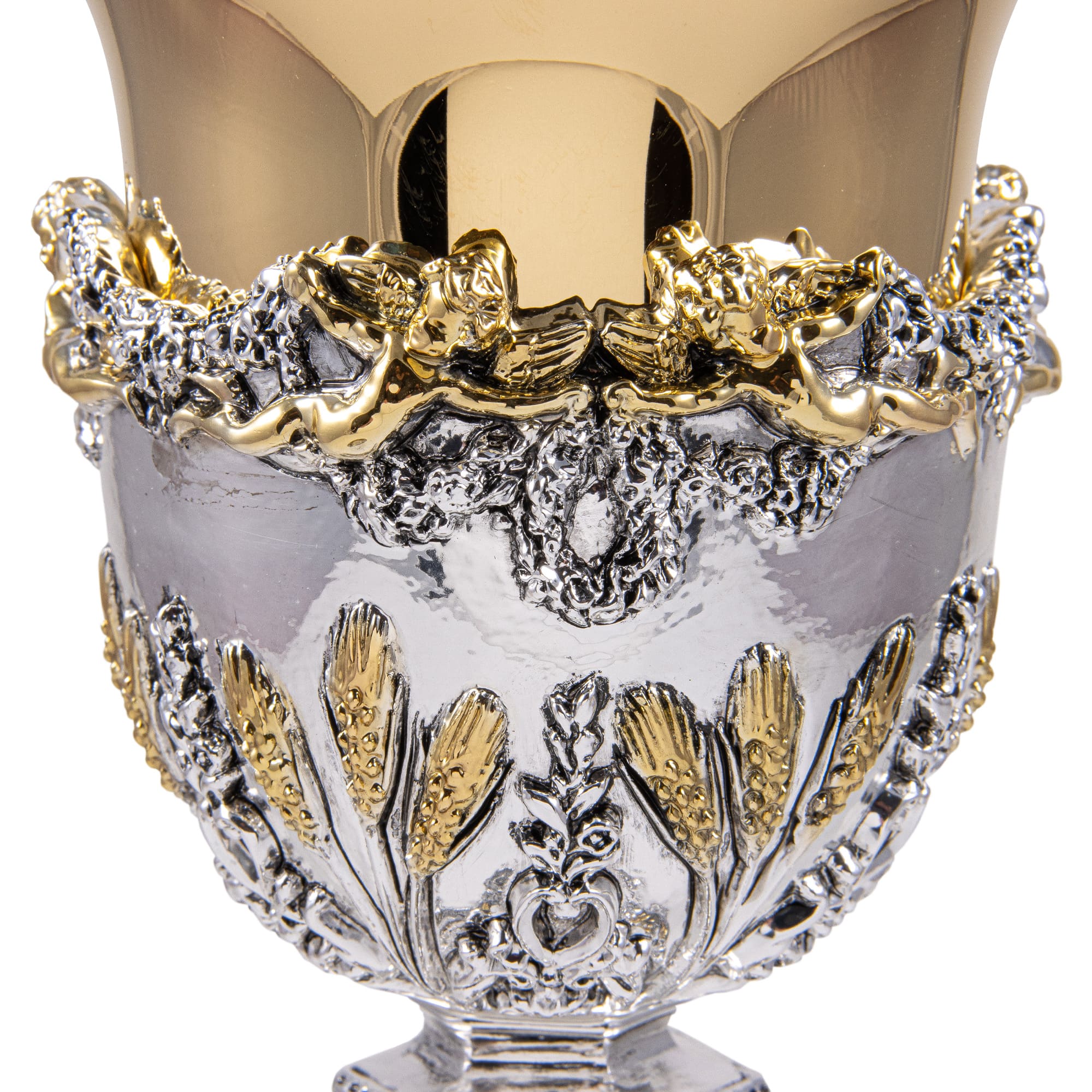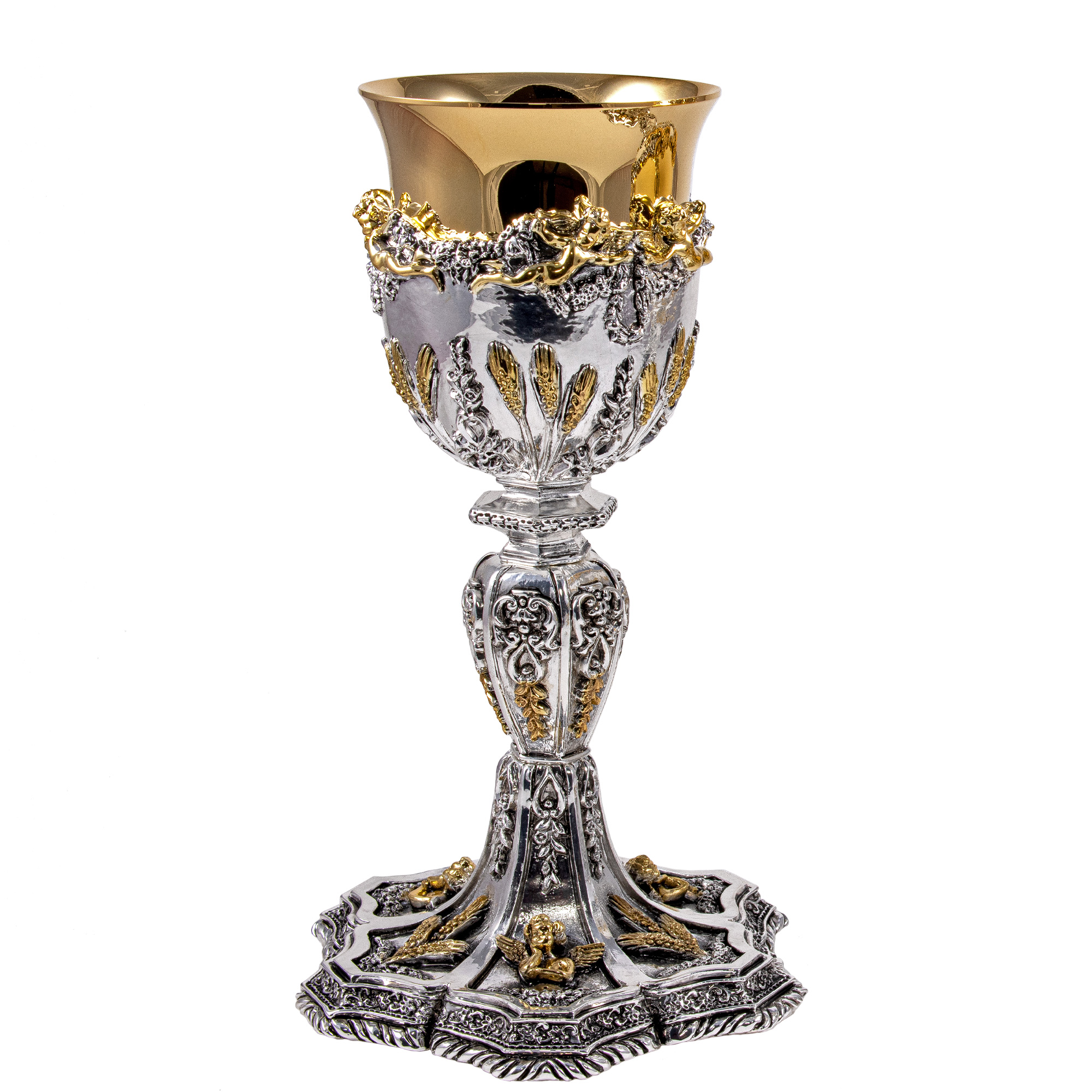Chalice and Ciborium in gold plated brass with an elegant "Angels and Wheat Ears" motif in a silver finish with gold details. The hexagonal base has a corded decoration on the edge. The chalice is 25.5 cm tall and has a 9.5 cm diameter cup that can hold up to 300 ml of wine. The Ciborium is 23.5 cm tall and has a 12 cm diameter cup that can hold up to 150 hosts.