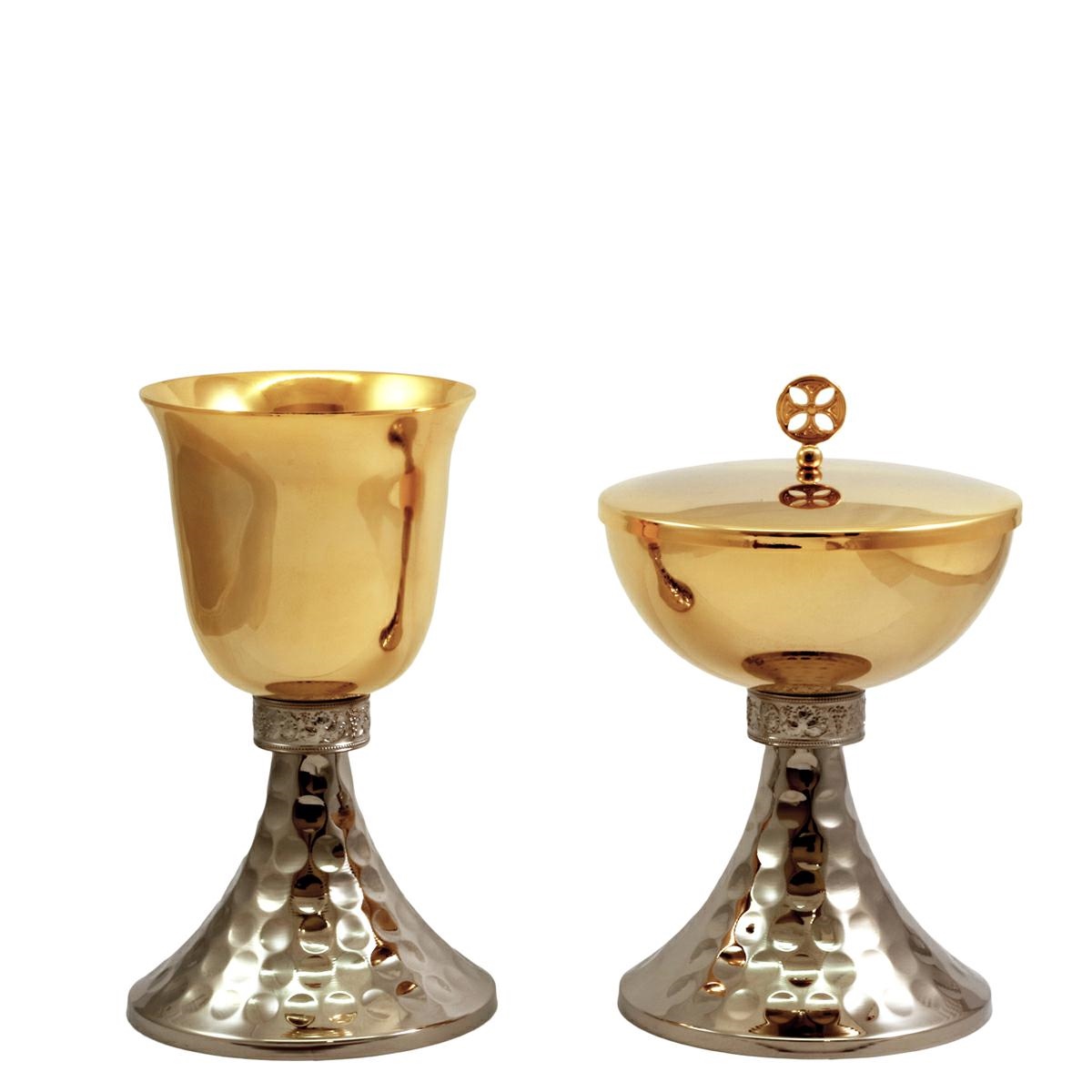 Calice e Pisside in ottone dorato con base martellata tono argento e nodo con decoro Uva e tralci di Vite.