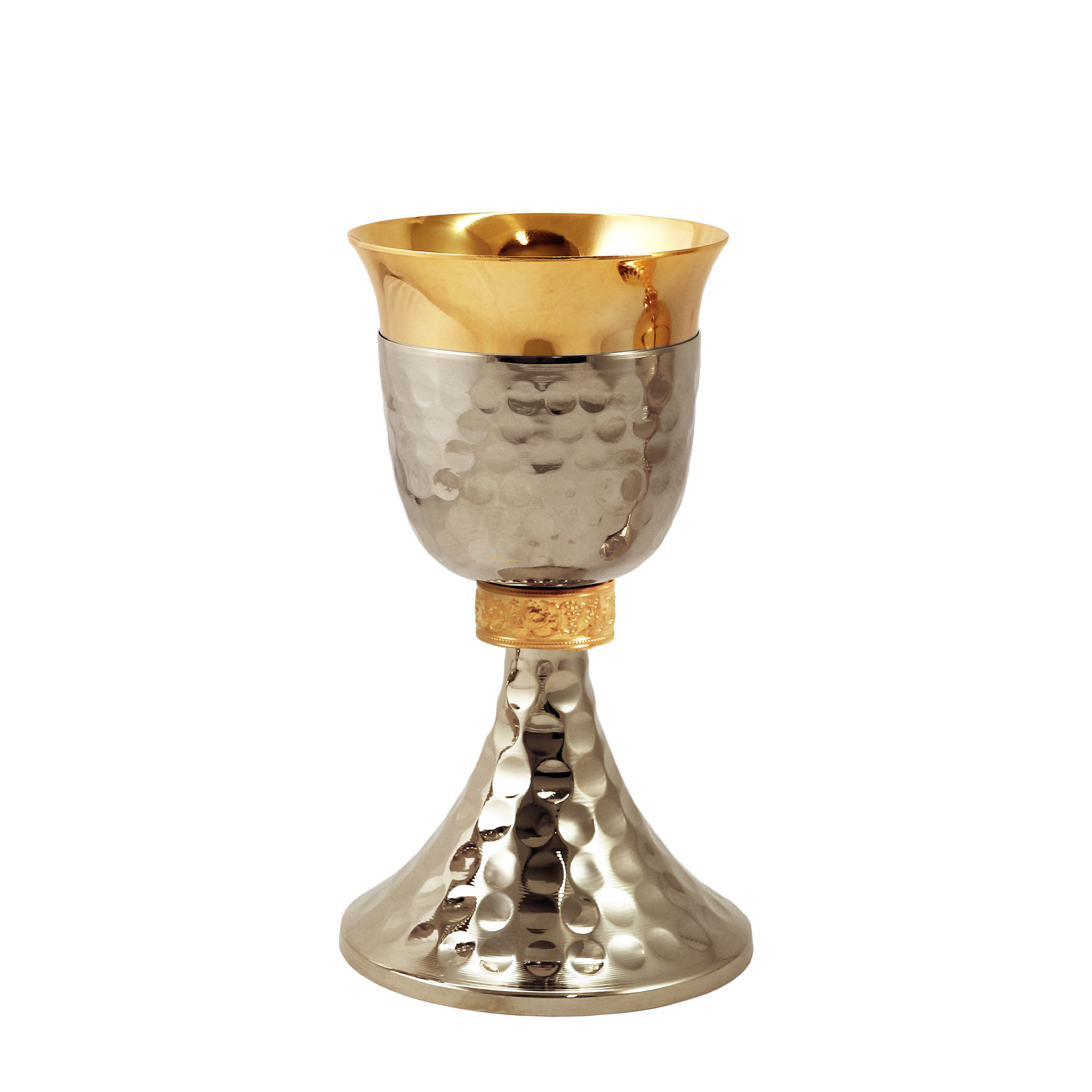 Chalice and Ciborium in gold plated brass with a base and saucer with silver-tone hammering and a golden knot decorated with grapes and vine leaves. The Chalice is 19 cm tall and has a 9.5 cm diameter cup that can hold up to 300 ml of wine. The Ciborium is 16 cm tall and has a 12 cm diameter cup that can hold up to 150 hosts.
