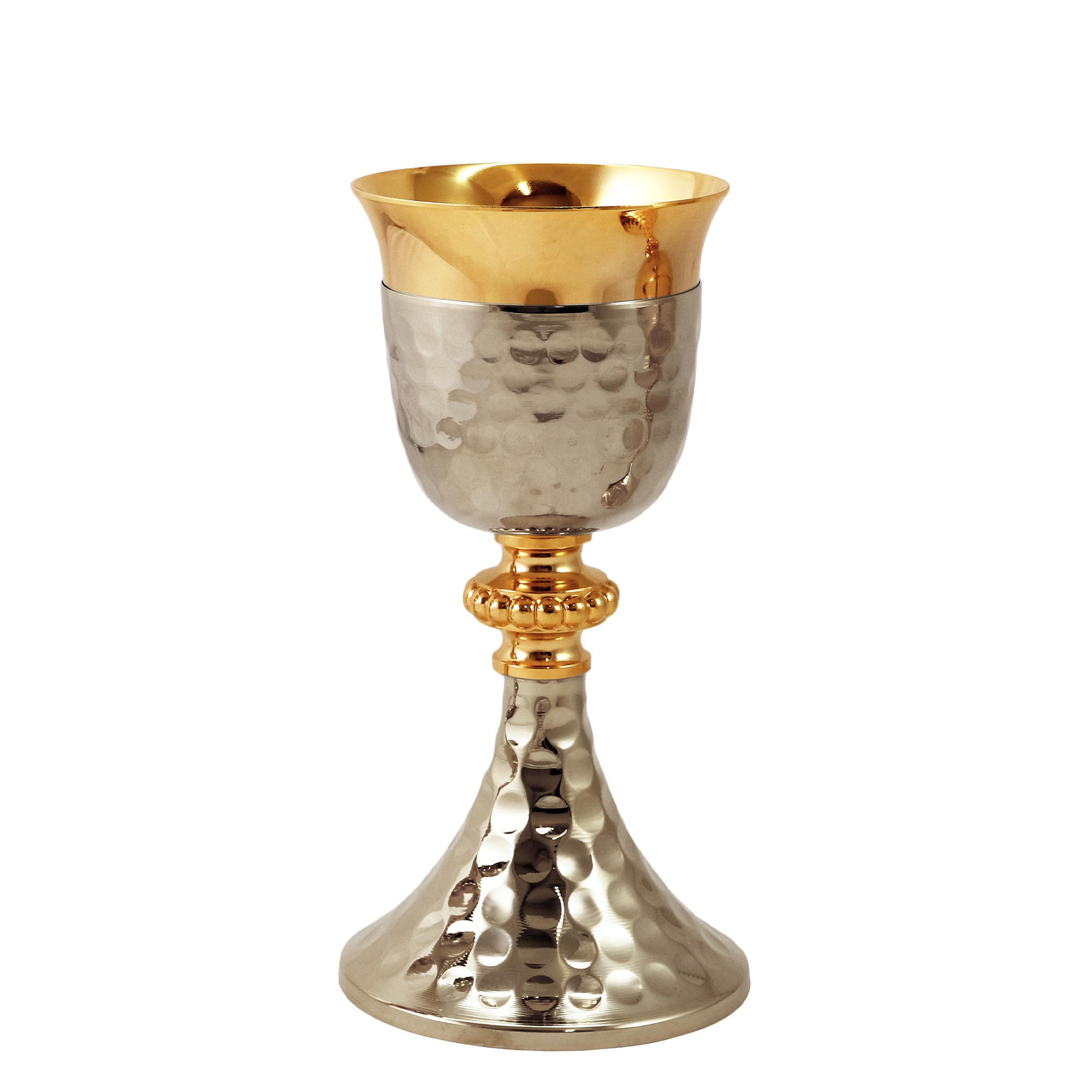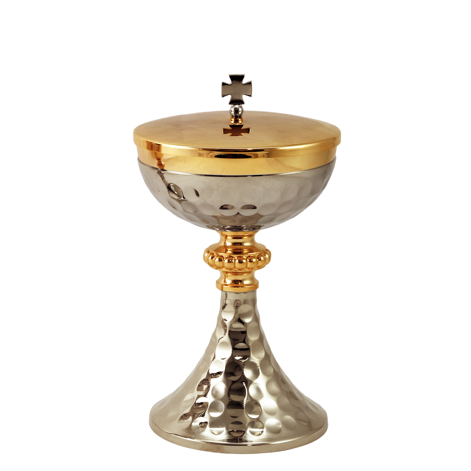 Chalice and Ciborium in gold plated brass with a silver-tone base and saucer with hammered detail and a gold-plated beaded knot. The Chalice is 20.5 cm tall and has a 9.5 cm diameter cup that can hold up to 300 ml of wine. The Ciborium is 19 cm tall and has a 12 cm diameter cup that can hold up to 150 hosts.