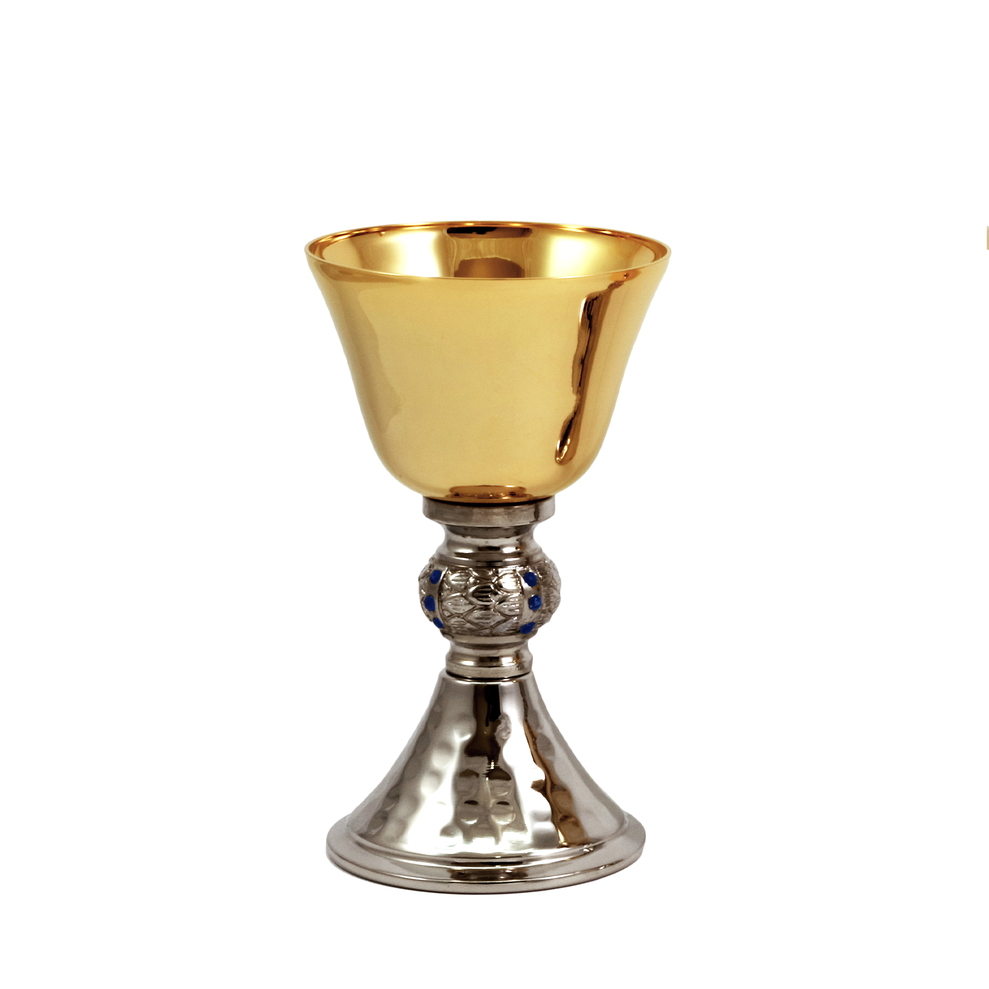 Calice e Pisside da viaggio in ottone dorato con base martellata e nodo in fusione con pietre decorative blu.