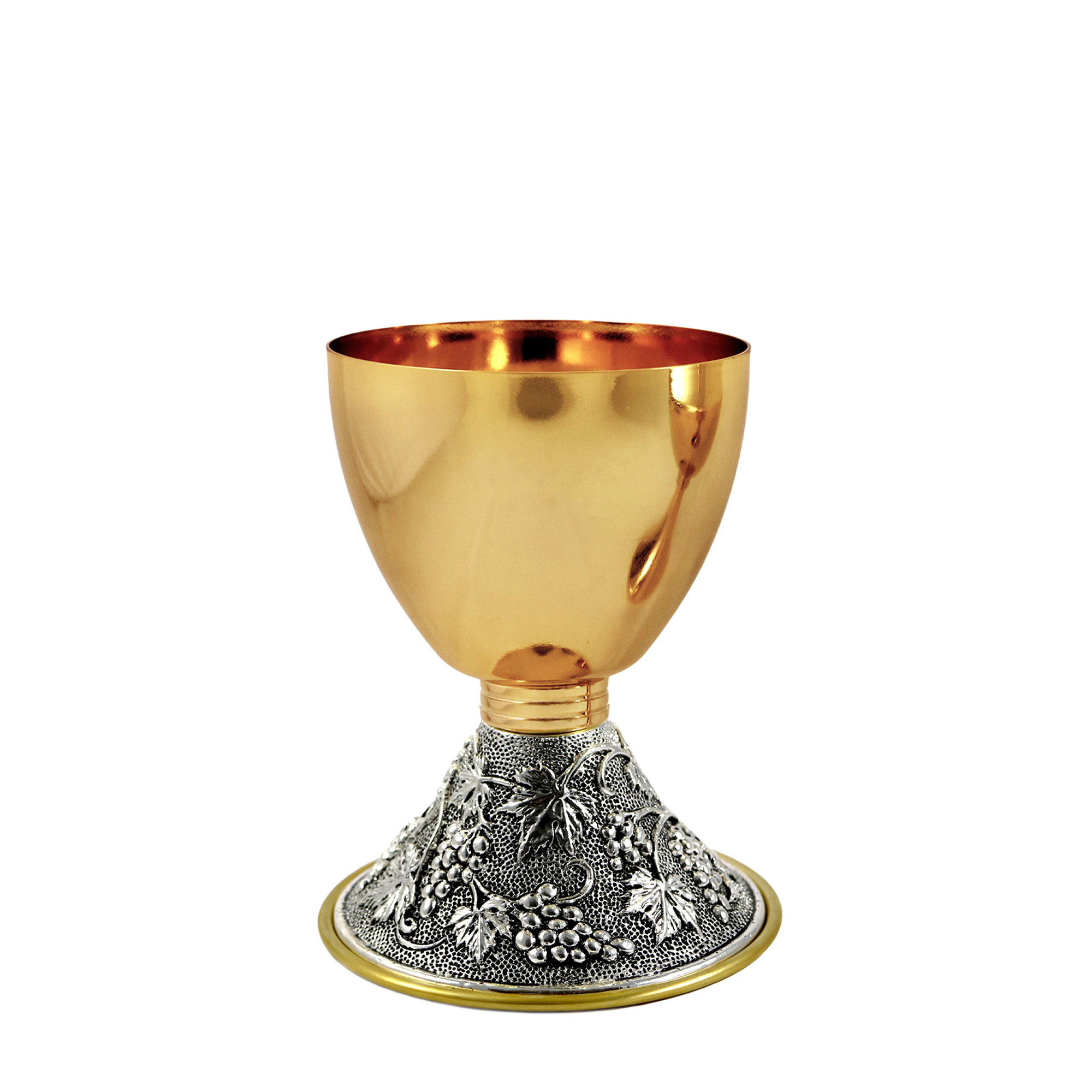 Calice e Pisside in ottone dorato con base "Uva e Foglie di Vite" in finitura argento antico.