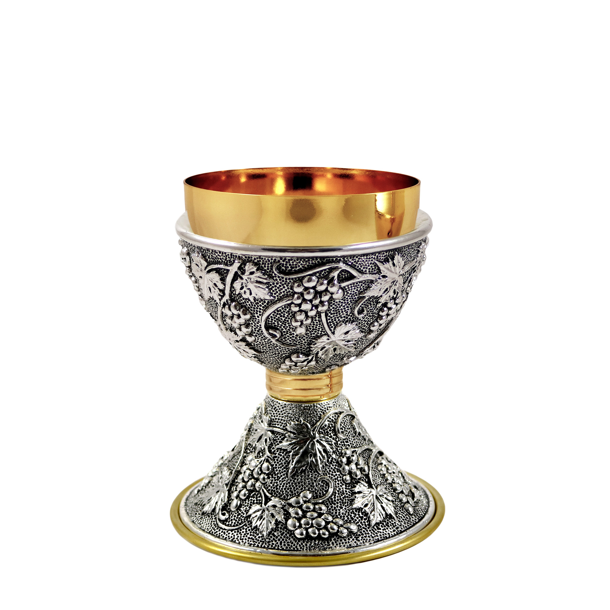 Calice e Pisside in ottone dorato con decoro "Uva e foglie di Vite" in finitura argento antico su base e sottocoppa.