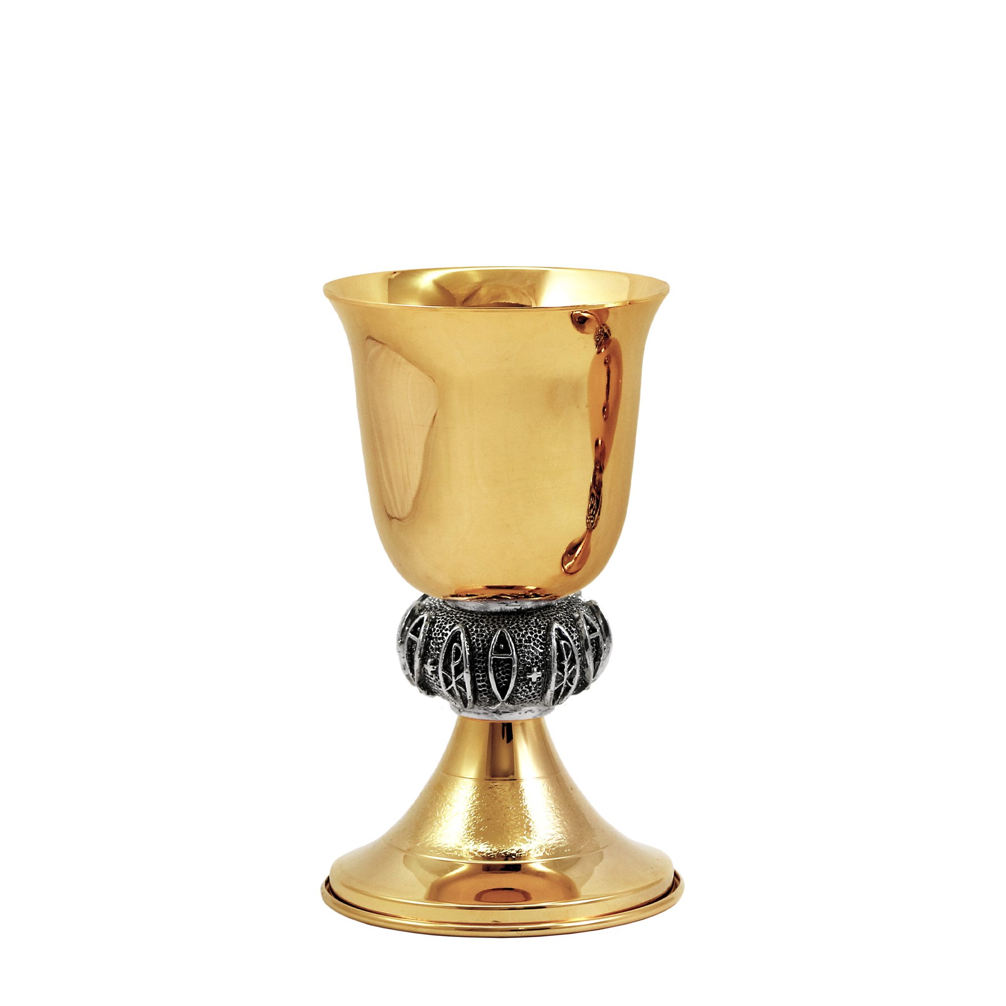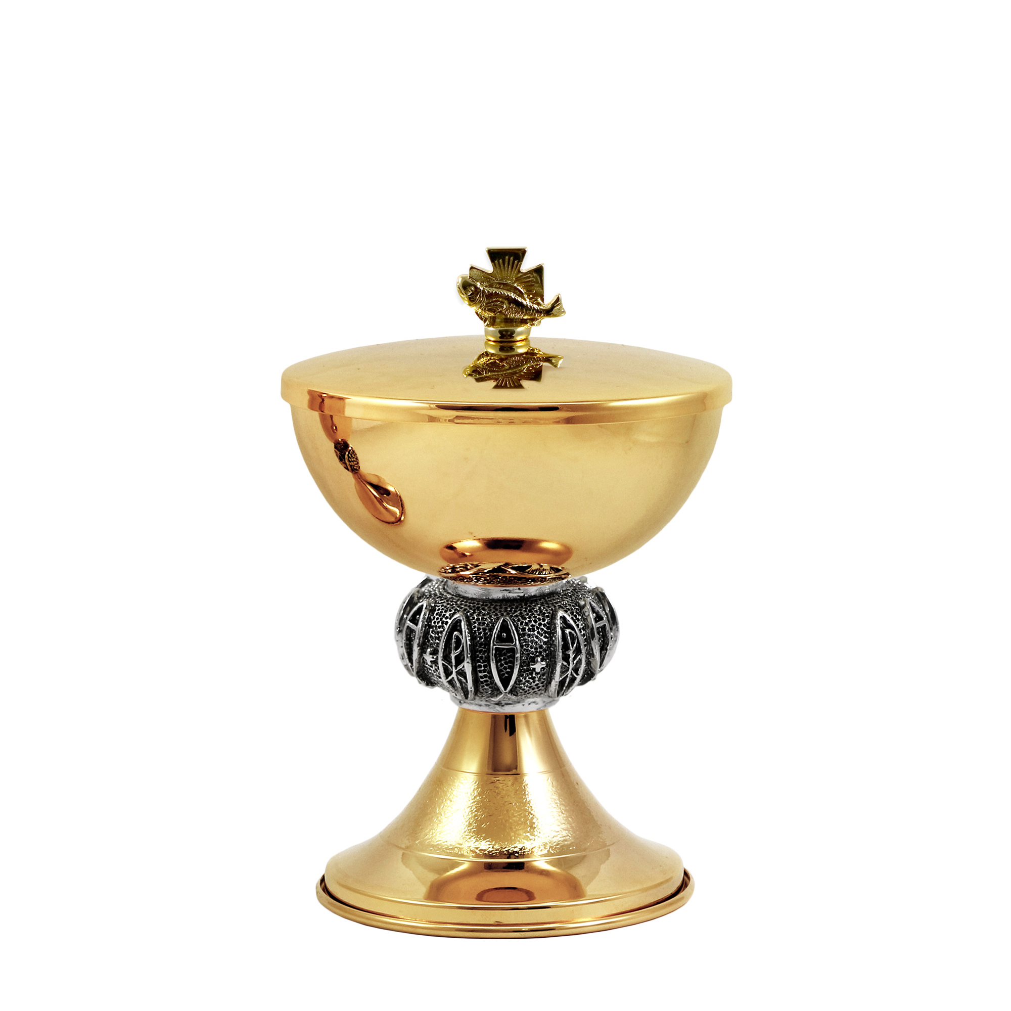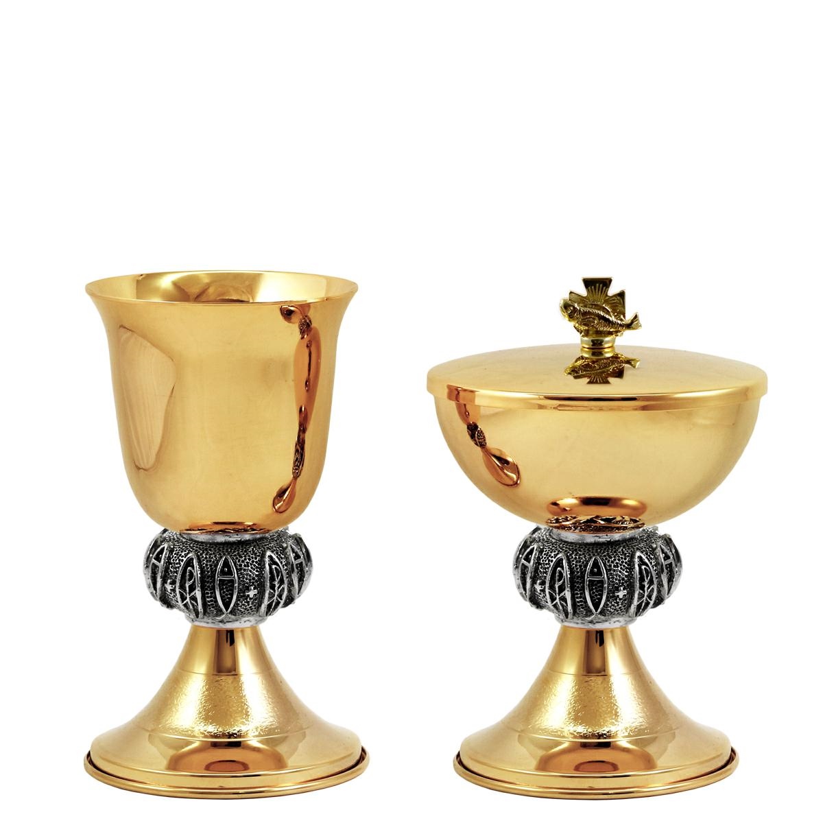 Calice e Pisside in ottone dorato con elegante nodo "Pesci e PX" in finitura argento antico.