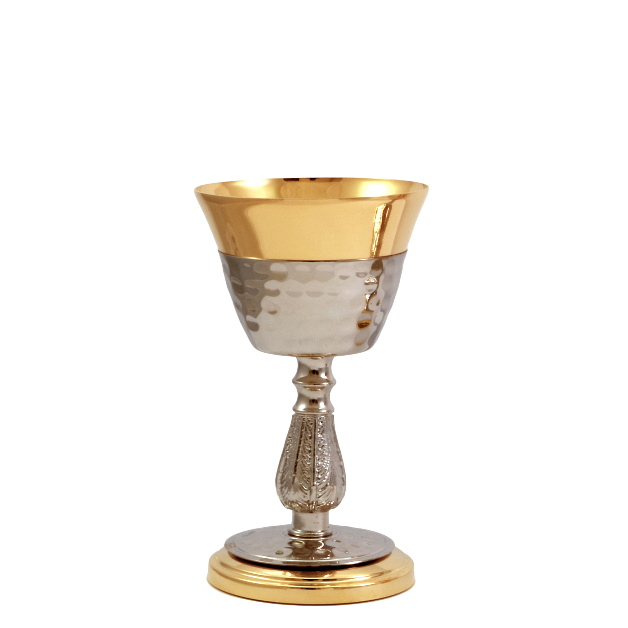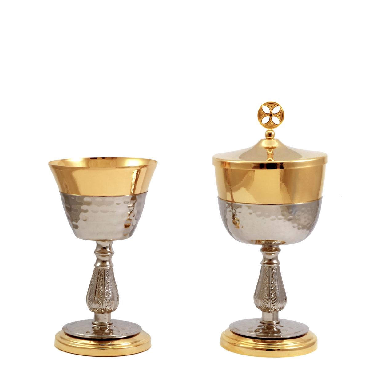 Calice e Pisside da viaggio in ottone dorato con base e sottocoppa martellata tono argento.