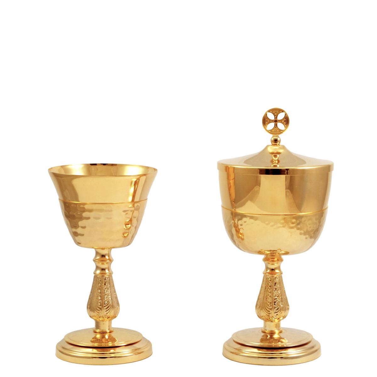 Calice e Pisside da viaggio in ottone dorato con base e nodo in fusione con decori e sottocoppa martellata.