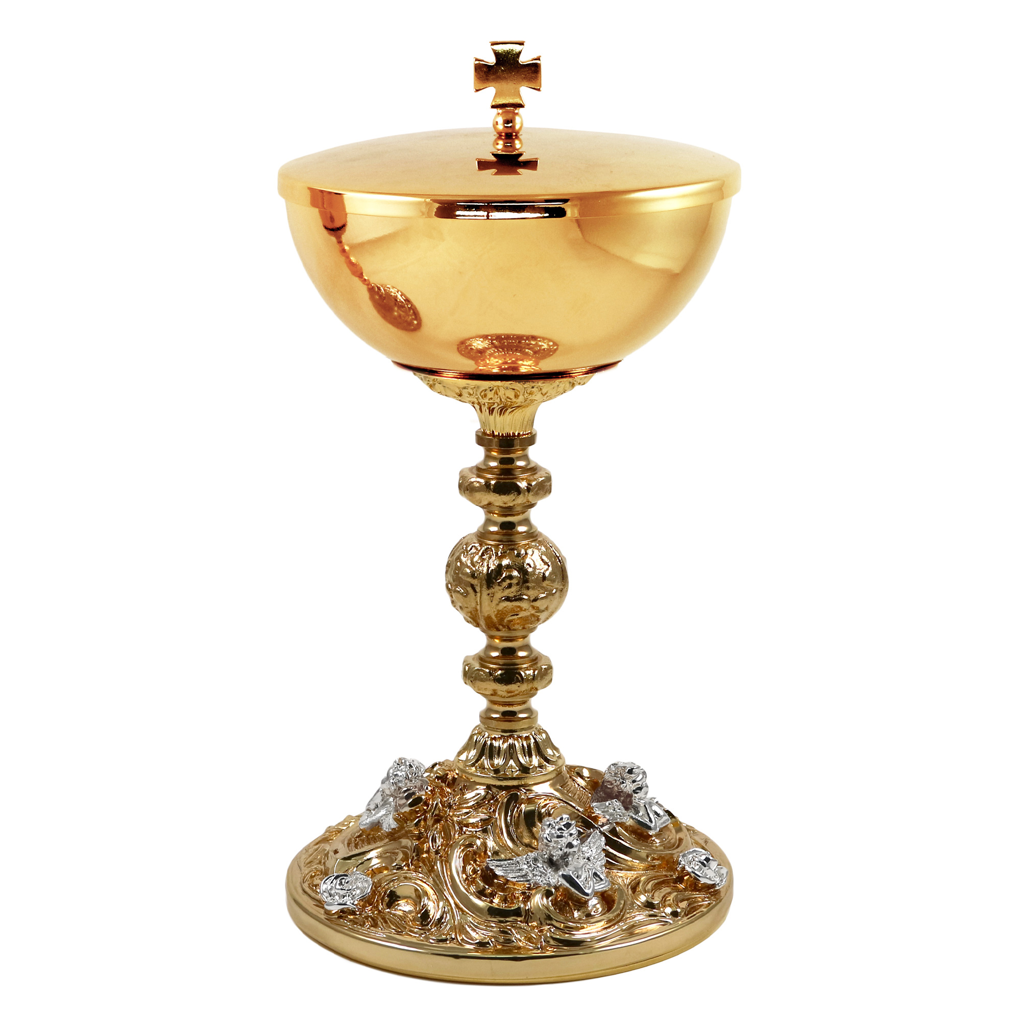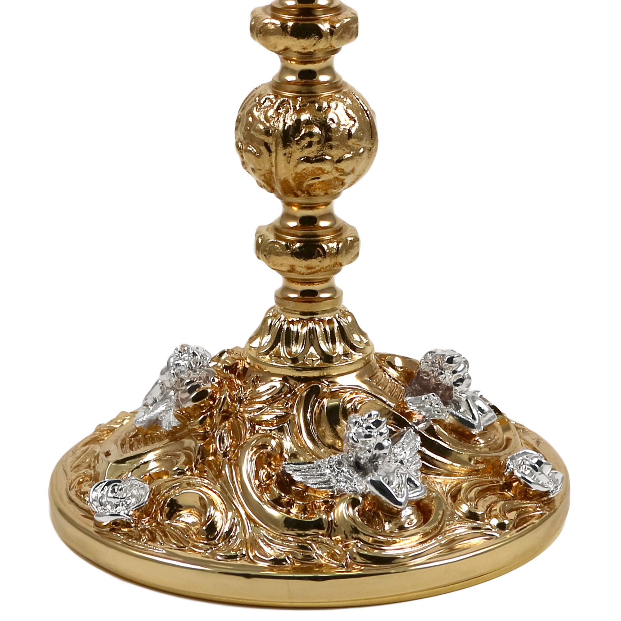 Calice e Pisside in ottone dorato con base barocca decorata con Angeli argentati.