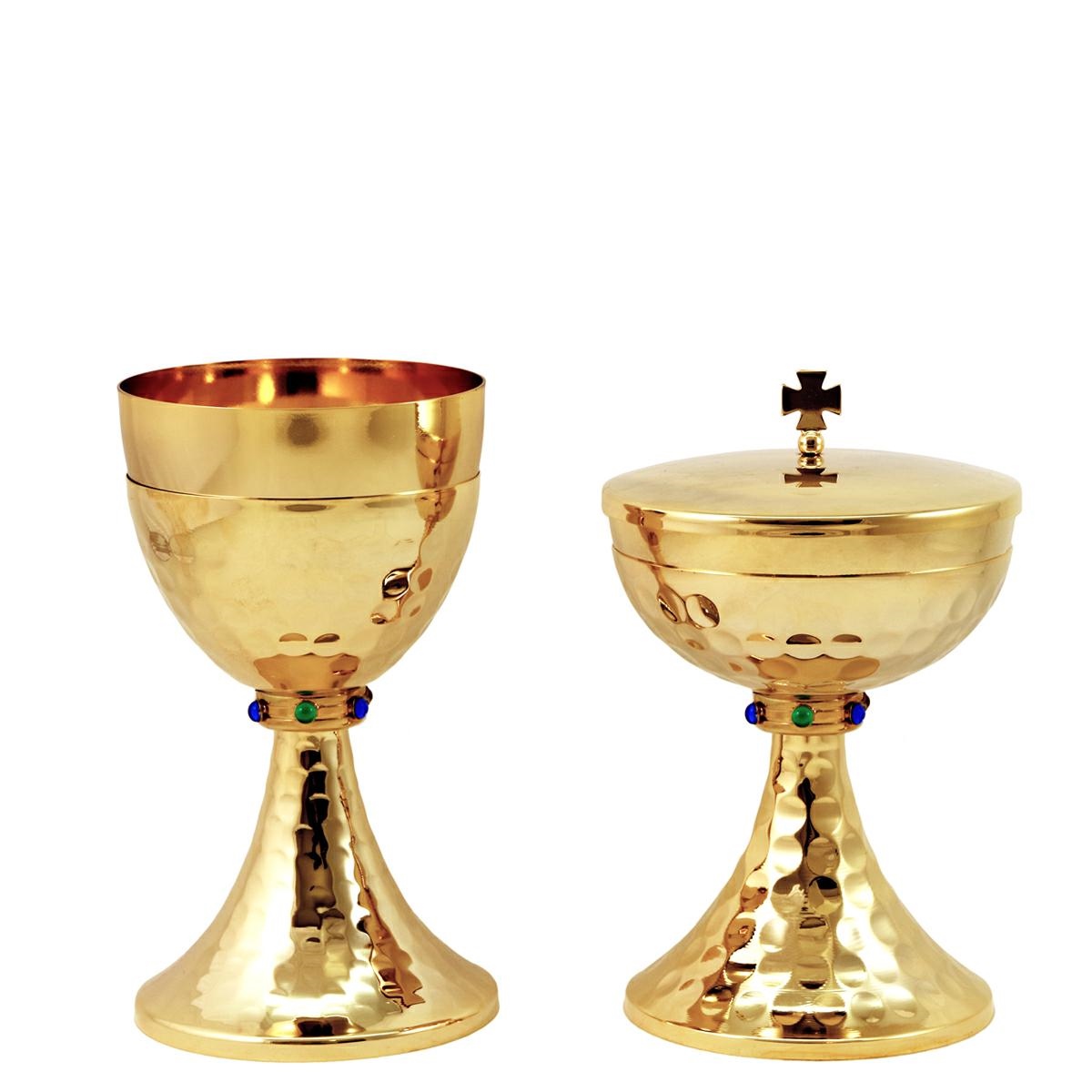 Calice e Pisside in ottone dorato con base e sottocoppa con martellatura e nodo dorato con pietre colorate.
