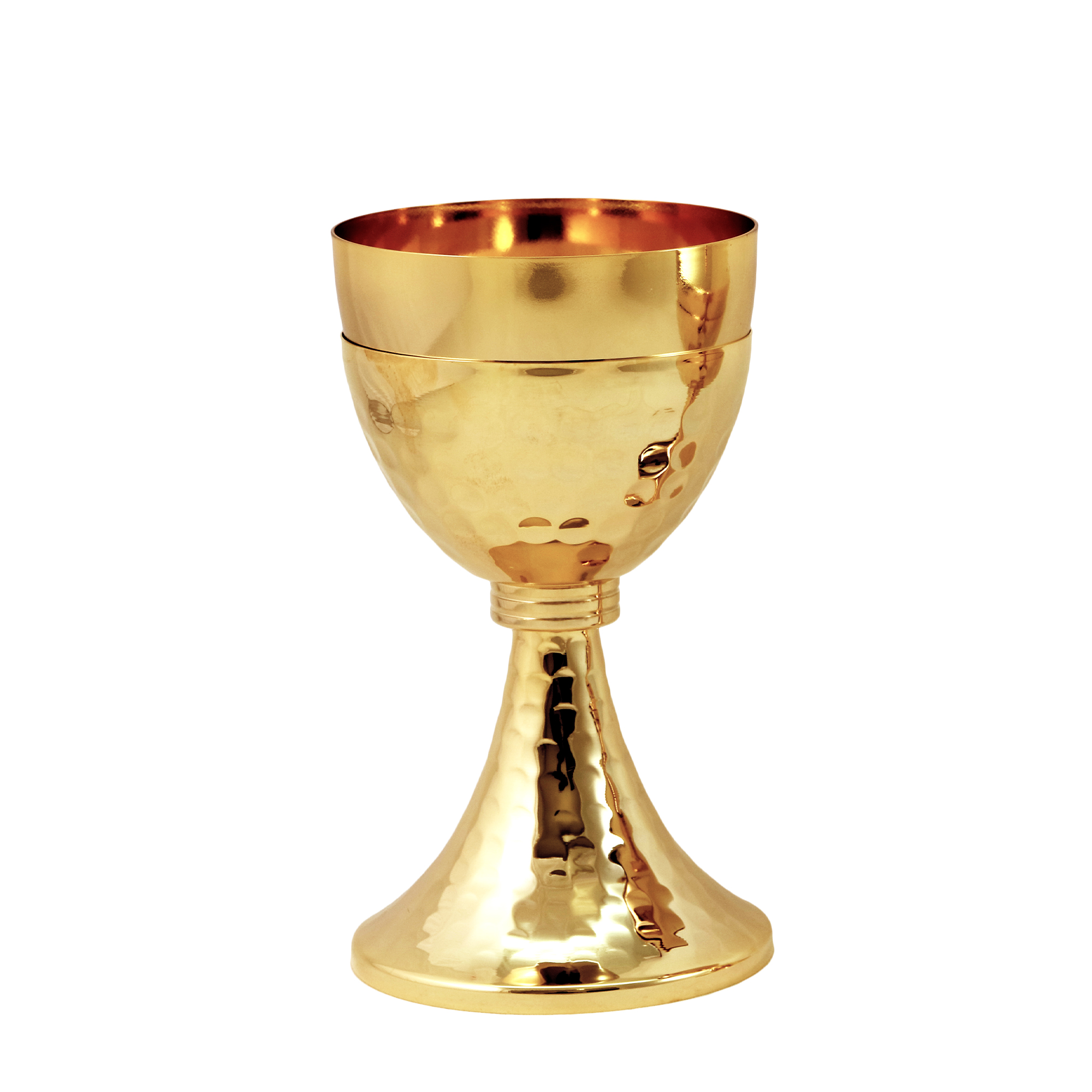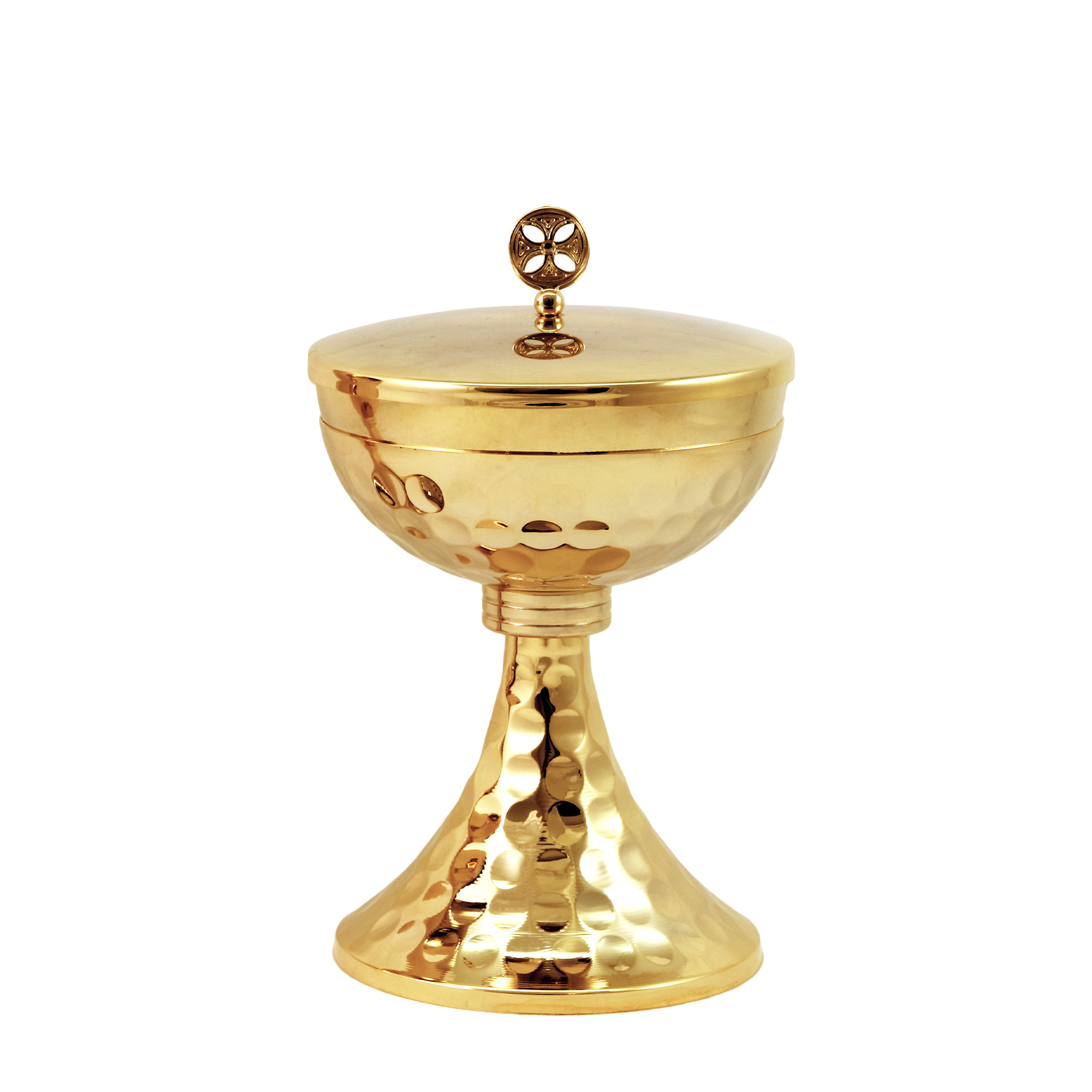 Chalice and Ciborium in gold plated brass with a hammered gilded base and saucer and a cast knot with a gilded finish. The Chalice is 18 cm tall and has a 10 cm diameter cup that can hold up to 350 ml of wine. The Ciborium is 16 cm tall and has a 12 cm diameter cup that can hold up to 150 particles.