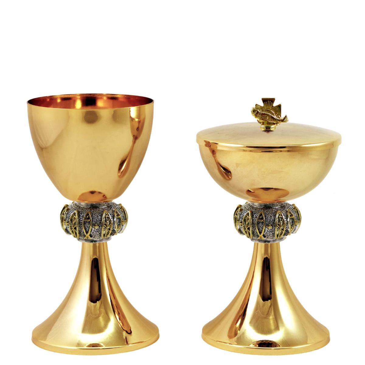 GOLD PLATED CHALICE AND CIBORIUM WITH FISH KNOP AND TWO-TONE PX