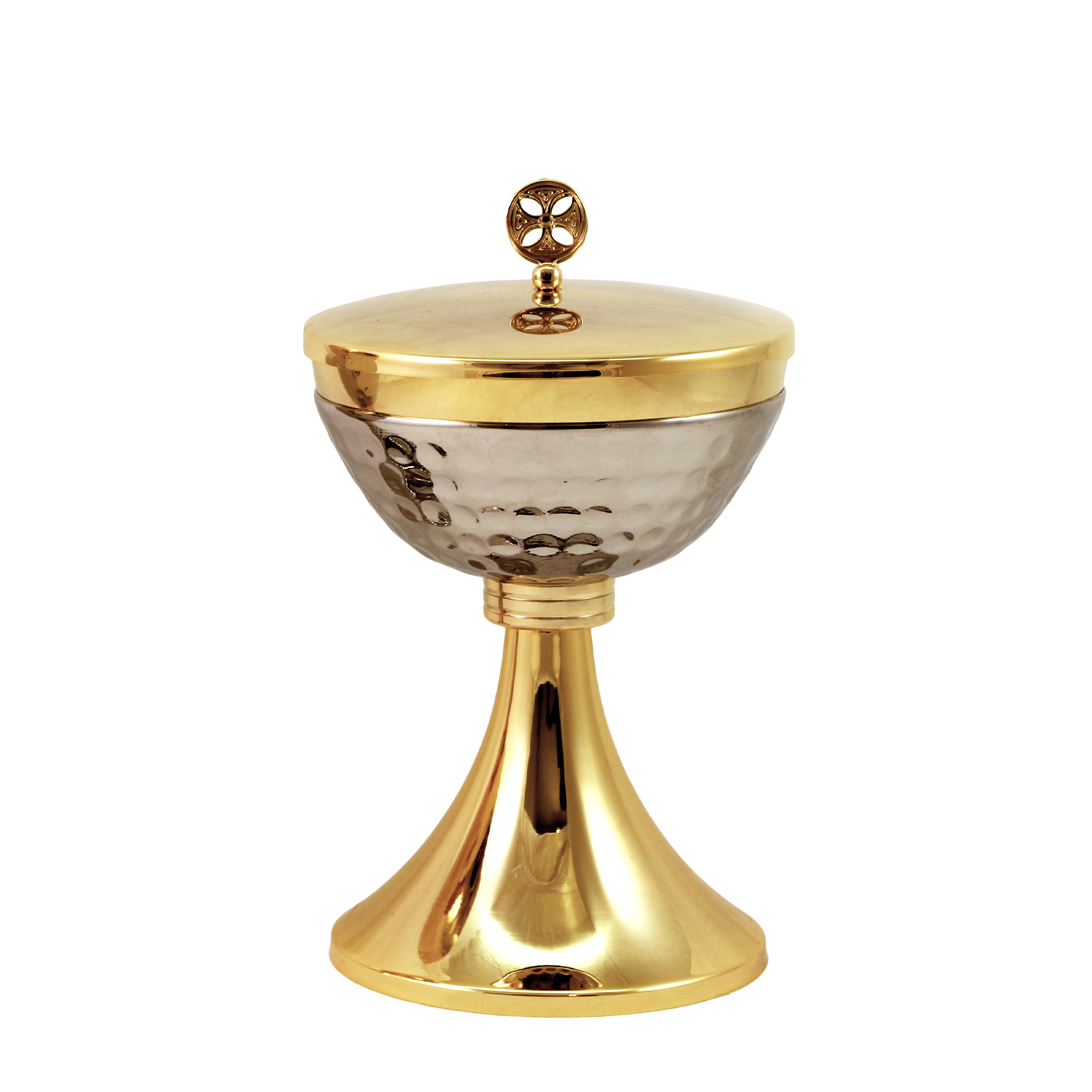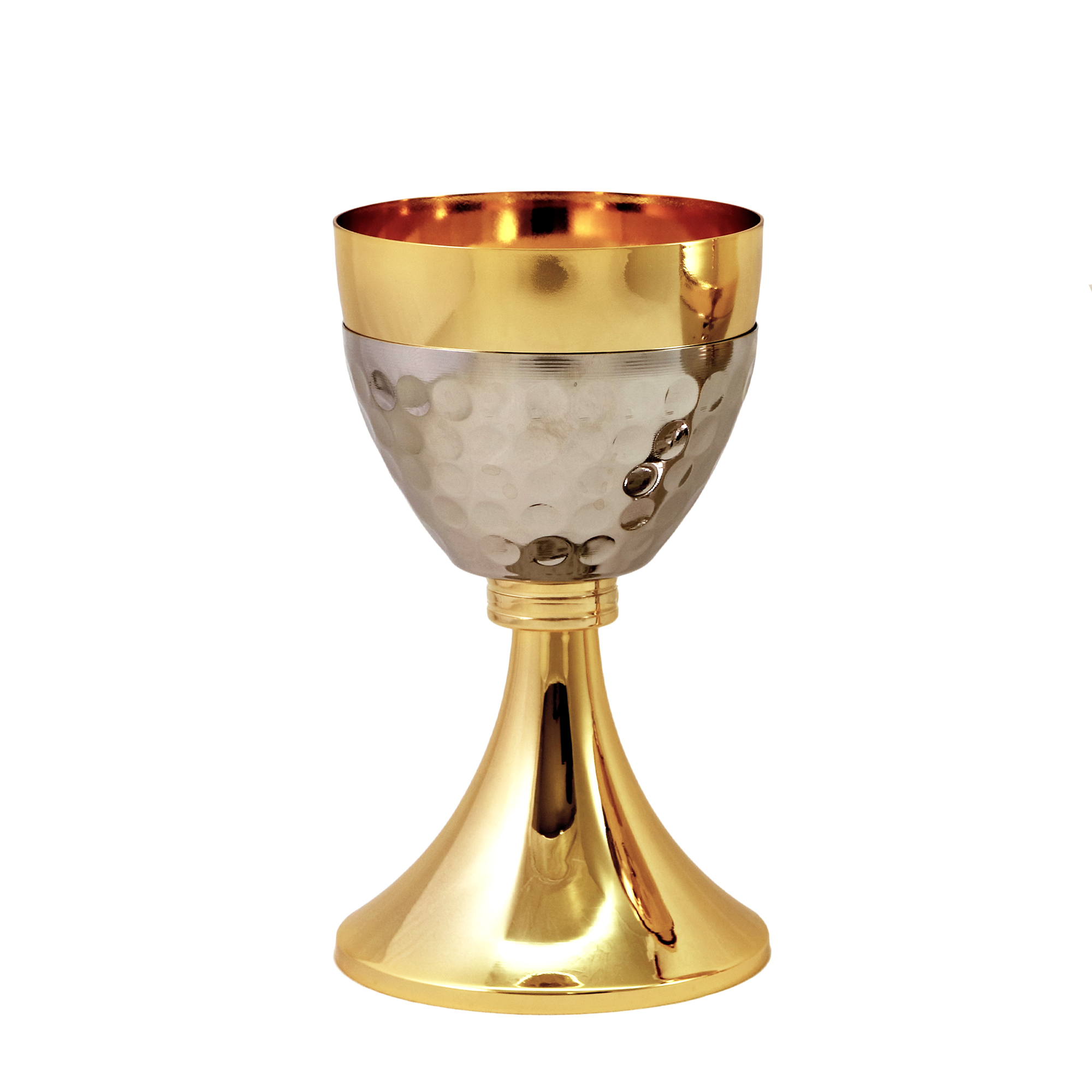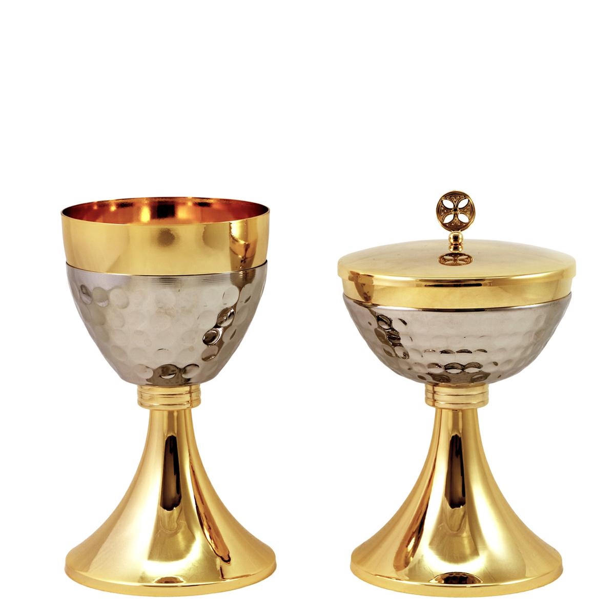 Chalice and Ciborium in gold plated brass with a smooth gilded base and a hammered silver-tone saucer. The knot is cast with a gold finish. The chalice is 18 cm tall and has a 10 cm diameter cup that can hold up to 350 ml of wine. The Ciborium is 16 cm tall and has a 12 cm diameter cup that can hold up to 150 hosts.