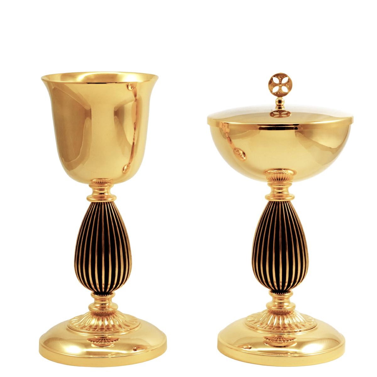 Calice e Pisside in ottone dorato con particolare nodo con rigature in finitura bronzo antico.