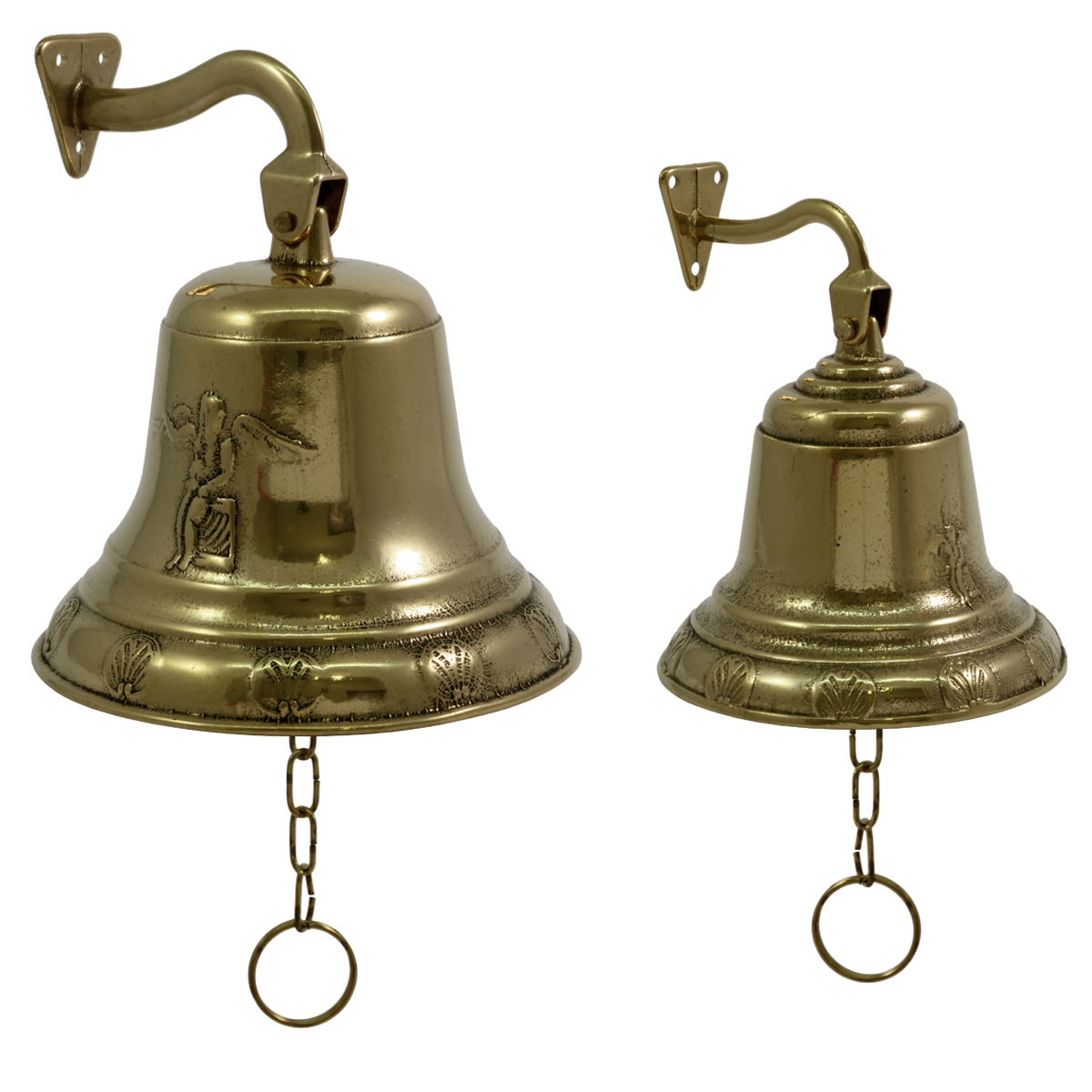 Campana a muro in ottone lucido con decoro angeli. Grazie al pratico gancio dotato di tre fori è possibile attaccarla al muro.