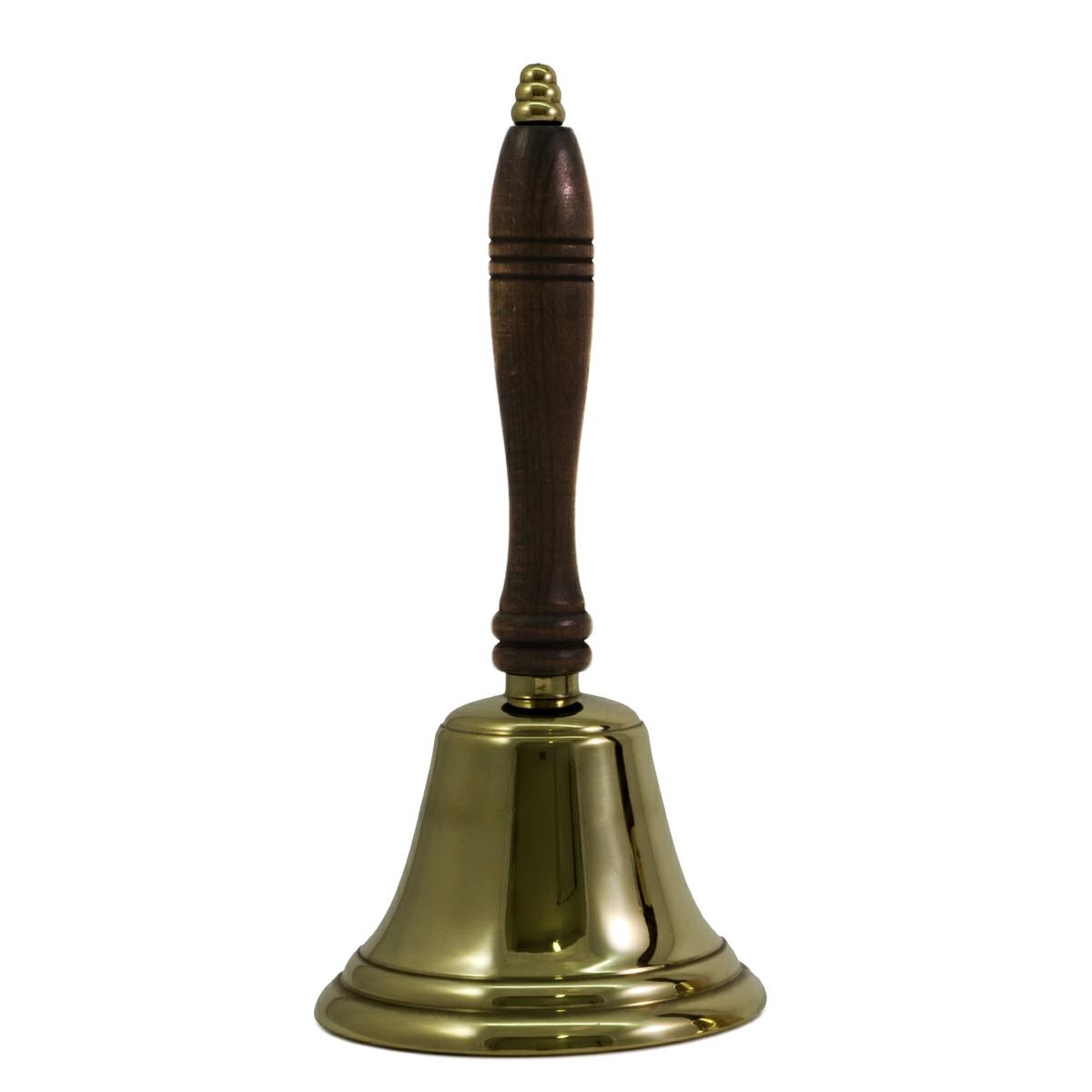 Polished brass bell with wooden handle for liturgical use.