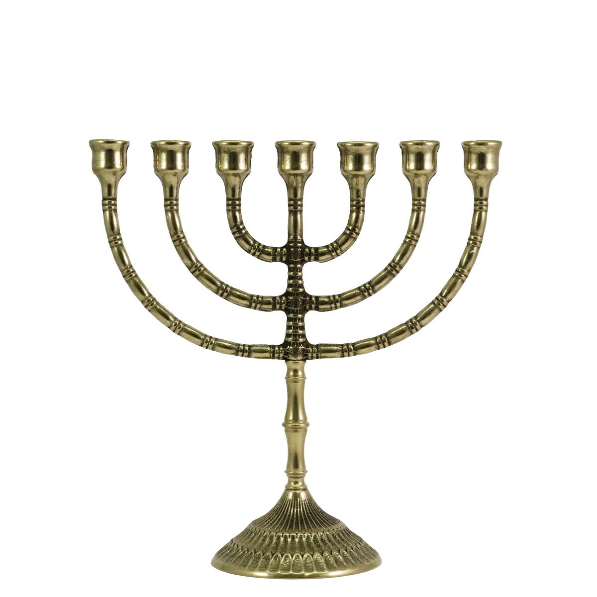 Candelabro menorah a sette fiamme in ottone lucido con base e braccia lavorate.