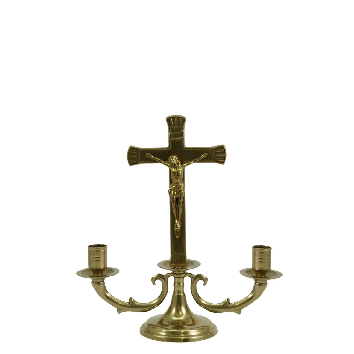 Candelabro in ottone lucido a 2 braccia completo di croce per altare.