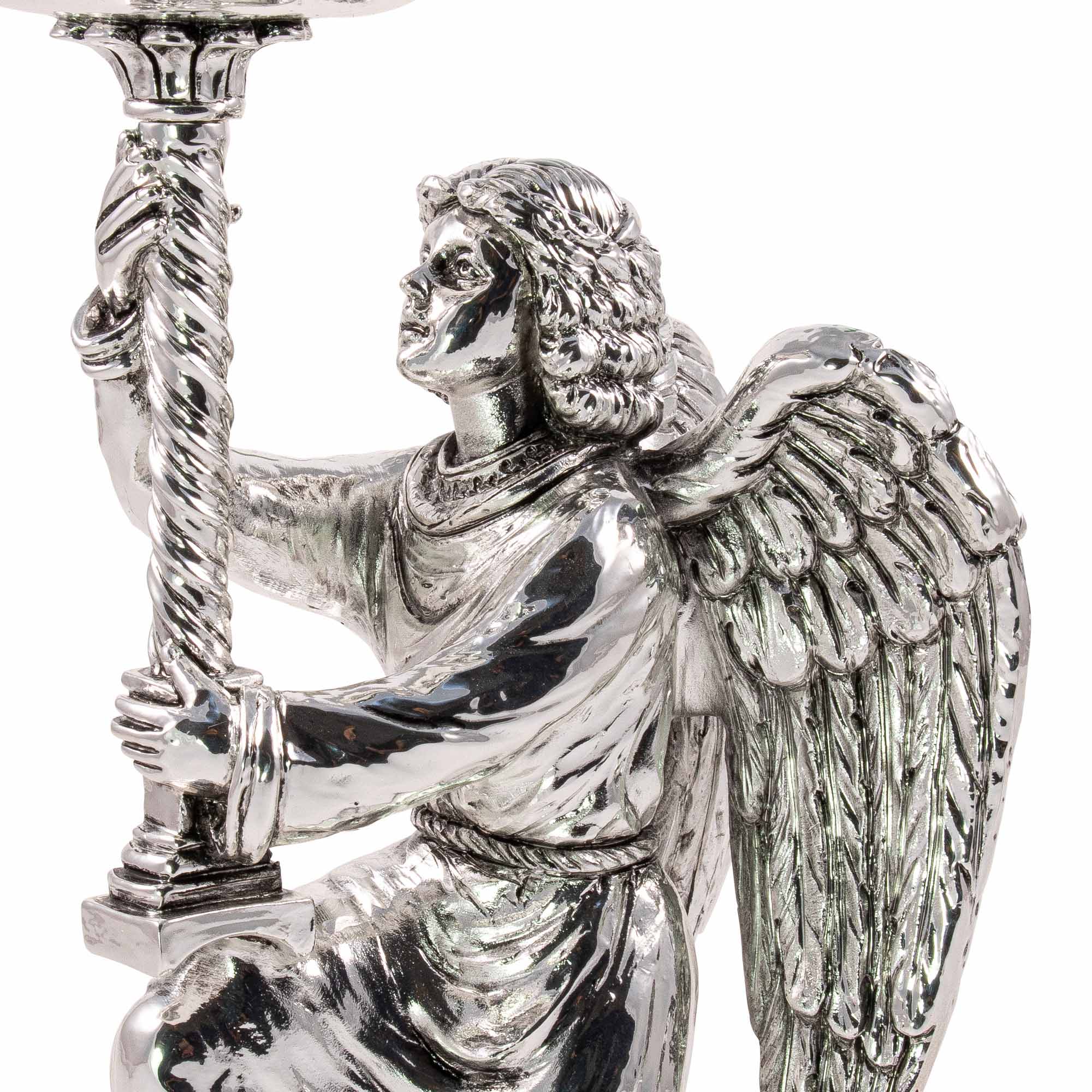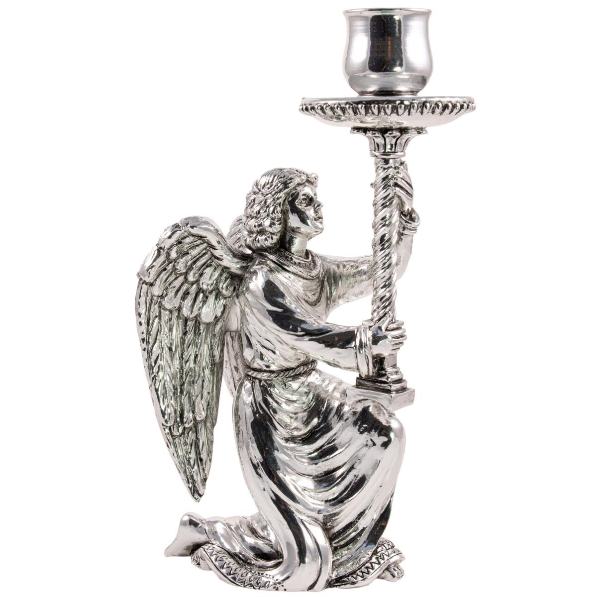 Elegante candeliere da altare in resina con finitura argento antico, raffigurante un Angelo inginocchiato che regge la base per la candela. Articolo realizzato interamente in Italia. Questo candeliere è alto 27 cm, largo 12 cm e profondo 7 cm. Ha un diametro per candele di circa 3 cm.