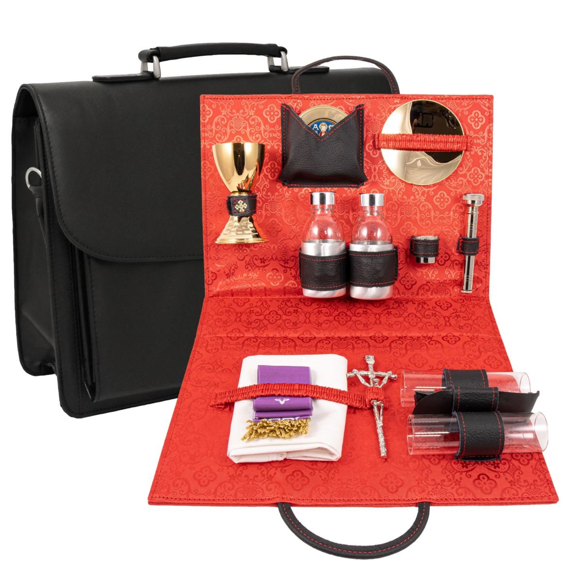 Elegant 24-hour briefcase in eco-leather with double closure. The storage panel is completely removable, lined in red satin and complete with everything necessary for the Celebration.