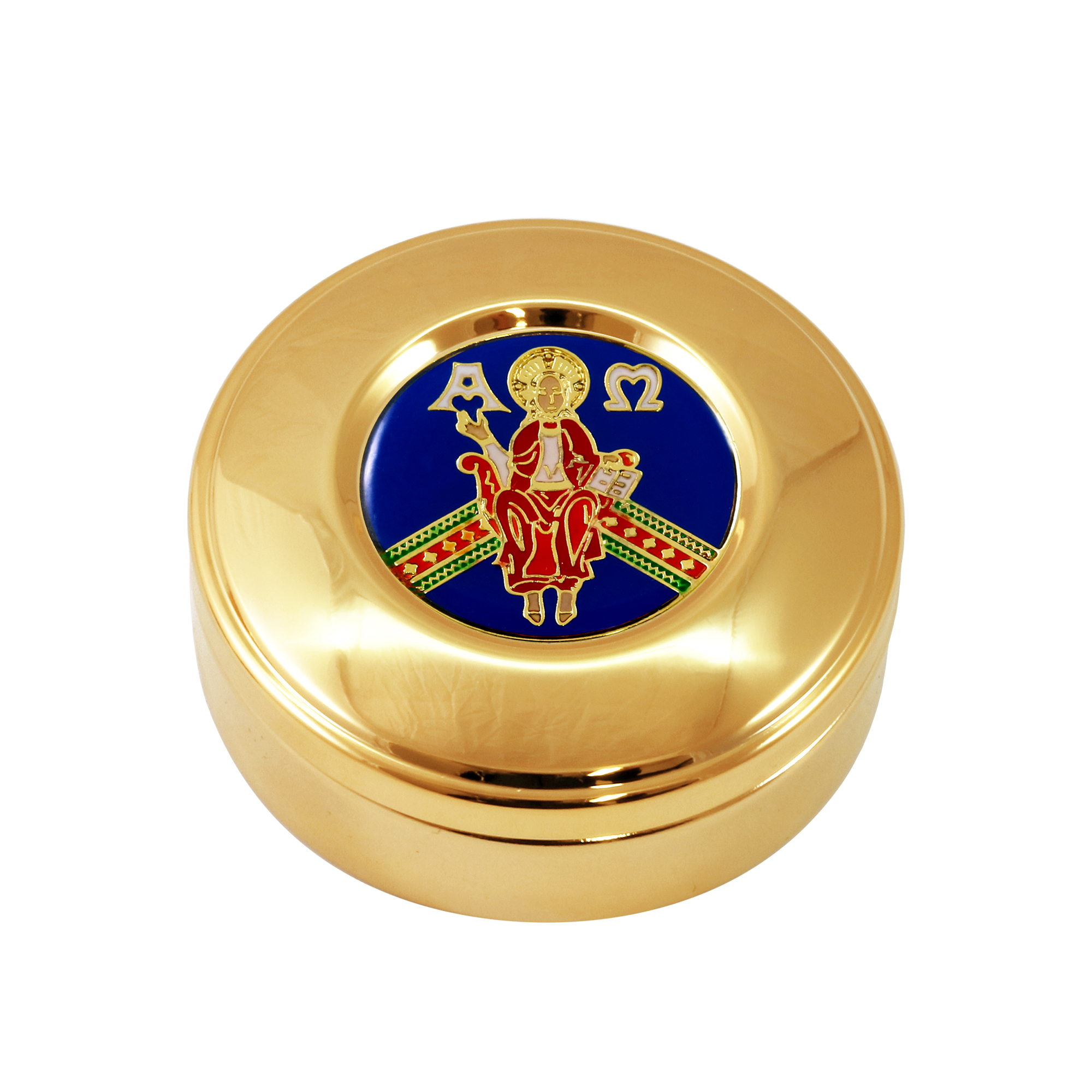 -Host box in gold-plated brass with decorative plaque. The Pyx has a diameter of 8 cm and holds approximately 40 hosts.