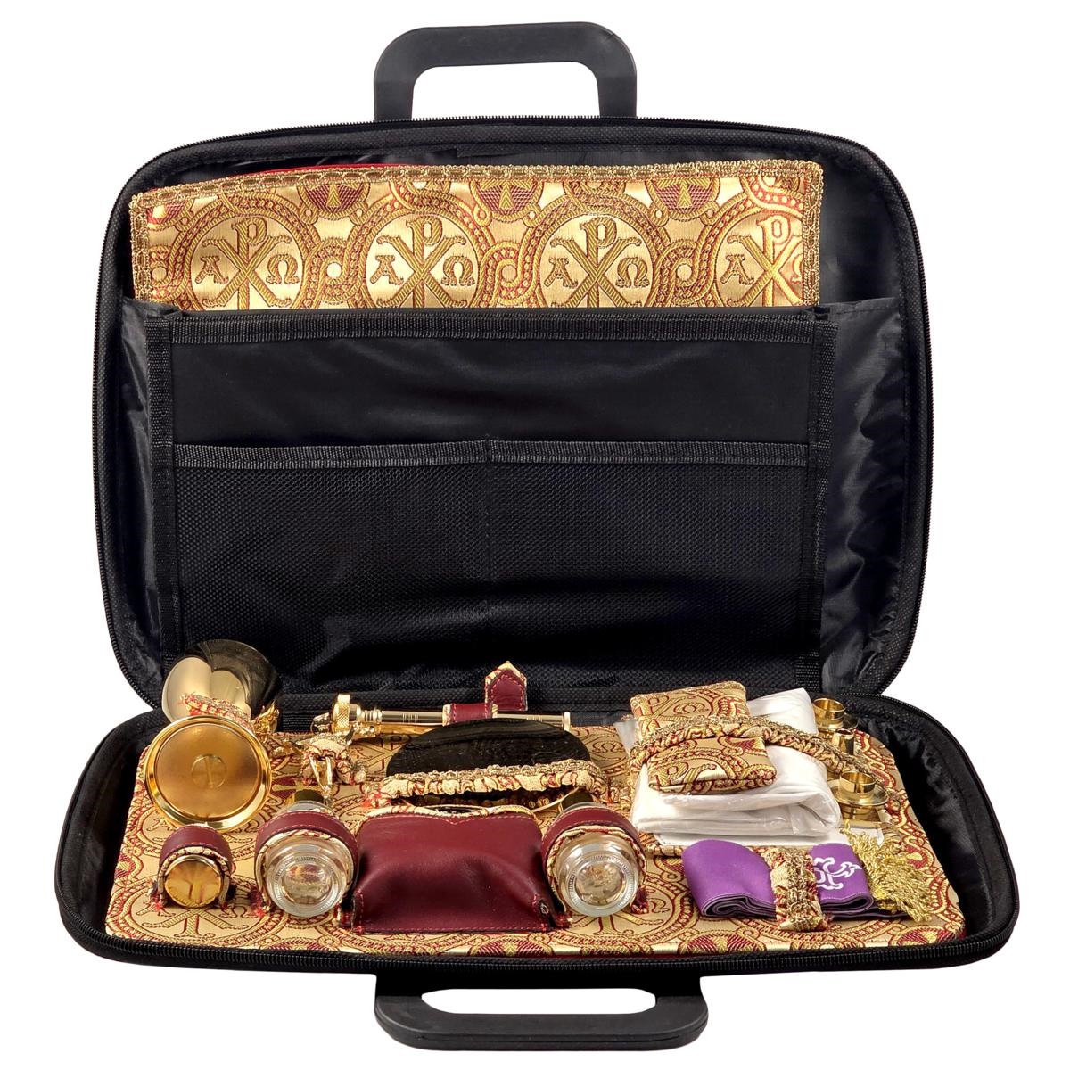 Cartella in Pelle Ecologica con tracolla salvaspalla, dotata di pannello estraibile foderato in elegante tessuto broccato Alfa & Omega e completa di tutto il necessario per la Celebrazione.
